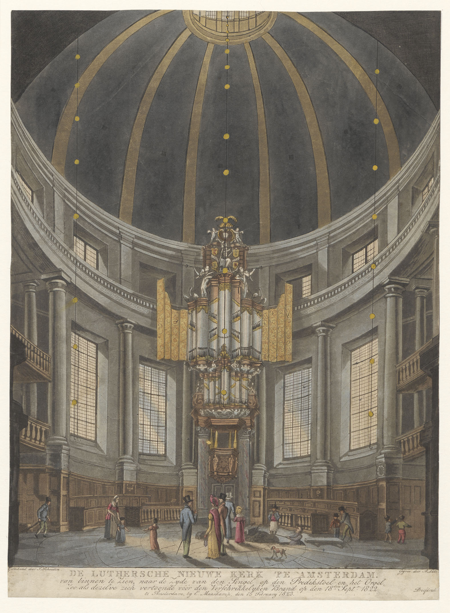 Interieur van de Lutherse Nieuwe Kerk te Amsterdam voor de brand van 1822, ingekleurd