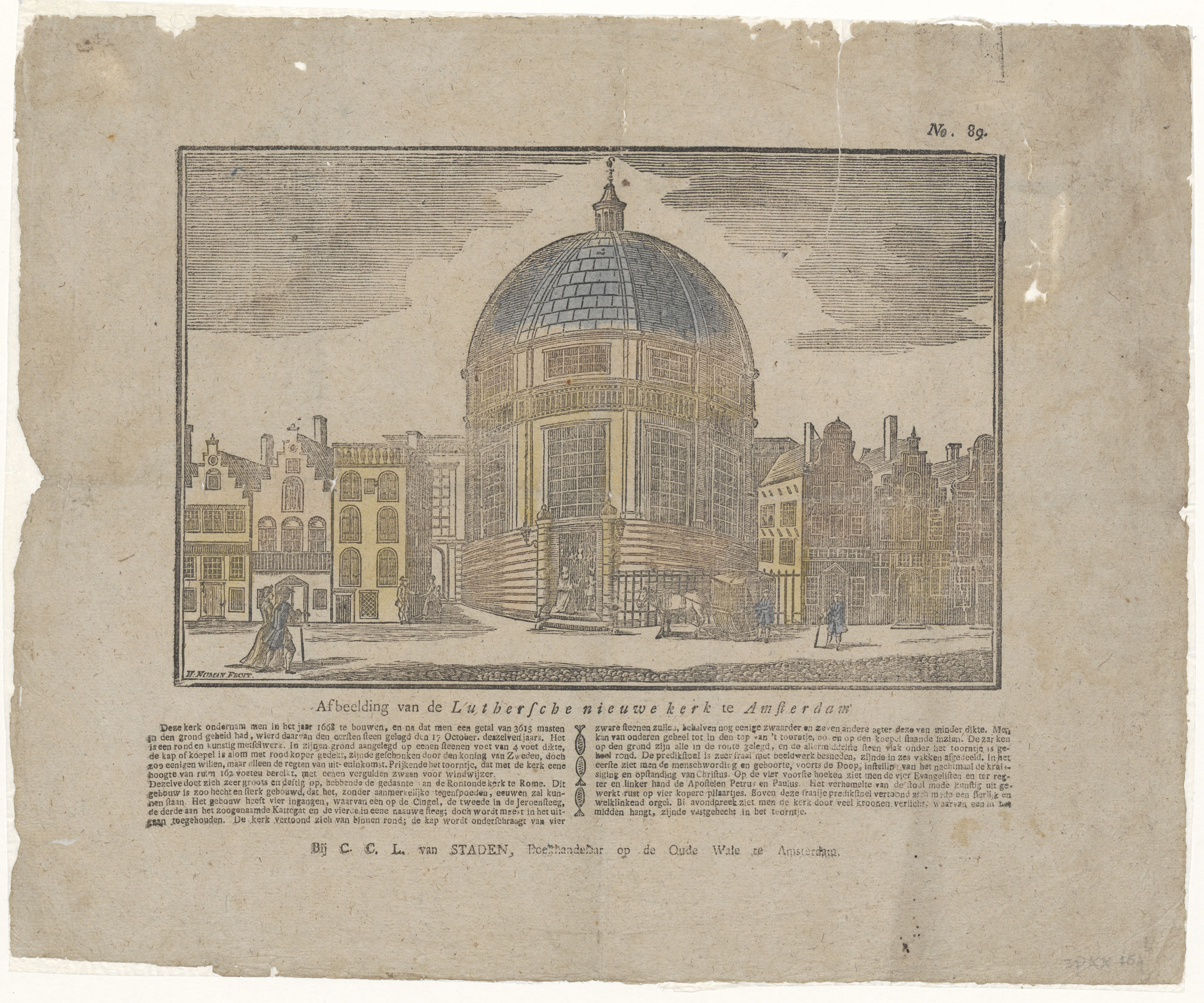 Afbeelding van de Lutherse Nieuwe Kerk te Amsterdam, Singelkant, ingekleurd