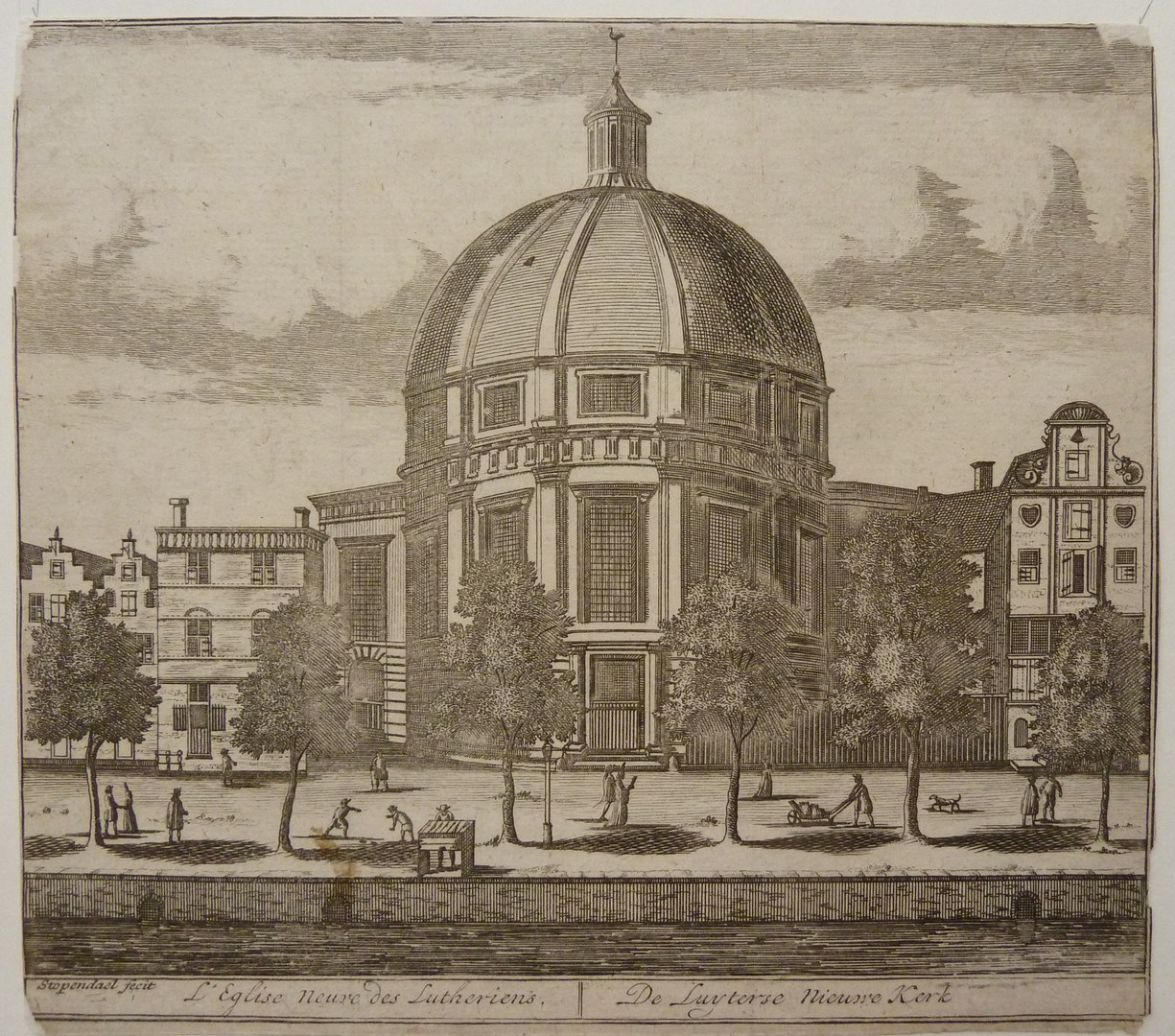 Centraal de Ronde (Nieuwe) Lutherse kerk aan het Singel te Amsterdam. Ter weerszijden huizen en ervoor een bomenrij. Voor de kerk wandelaars en spelende kinderen. Eenregelig onderschrift: 'L'eglise neuve des Lutheriens/ De Luyterse Nieuwe Kerk'.