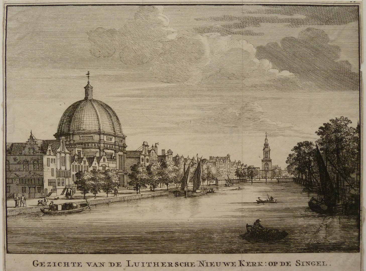Gezicht op de Lutherse (Nieuwe) Nieuwe Kerk aan het Singel. Ter weerszijde van het Singel een bomenrij. Gezicht op een brug en een toren. In het water enkele schepen.