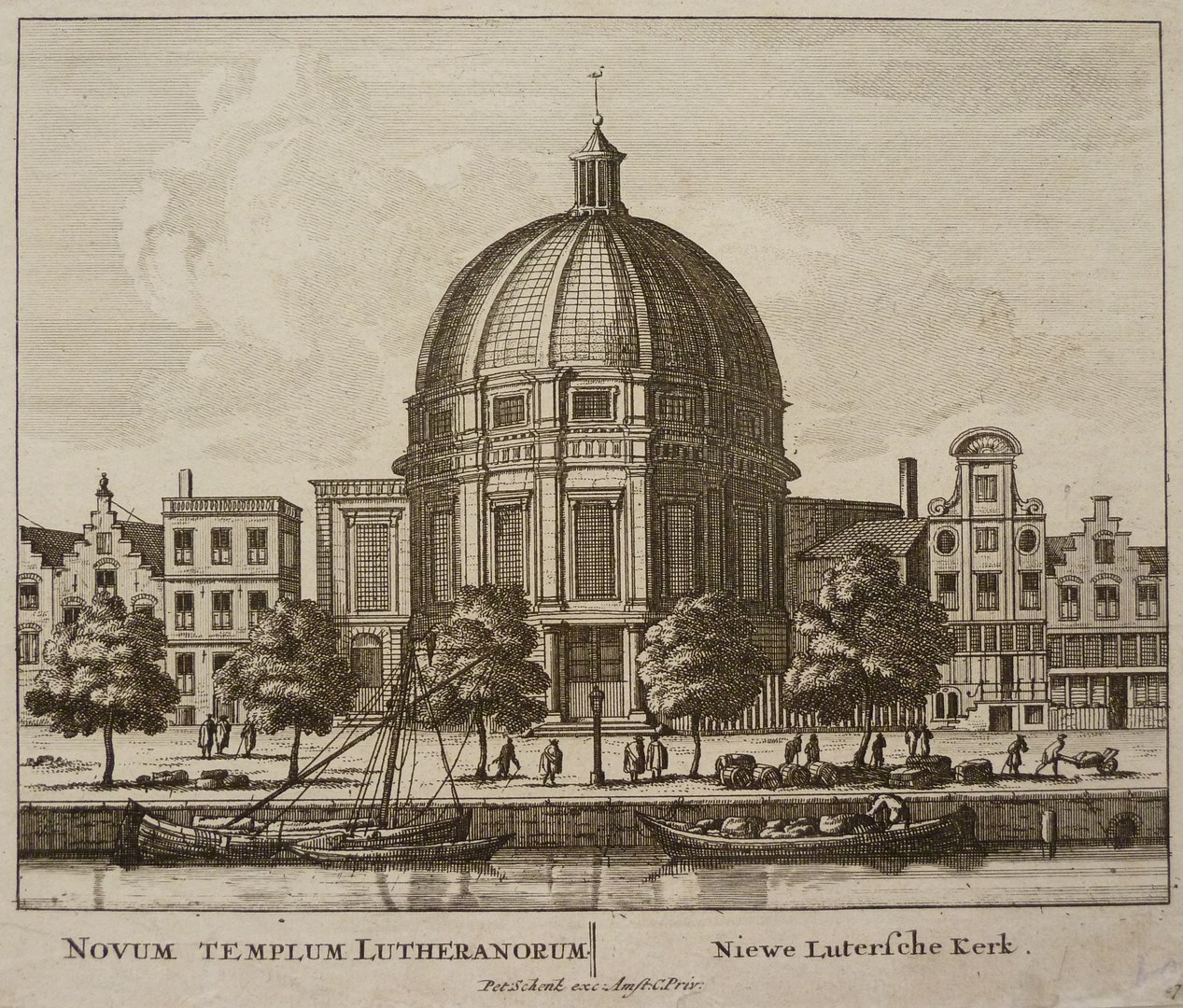 Gezicht op de (Nieuwe) Ronde Lutherse Kerk, vanaf de overzijde van het water. Centraal het kerkgebouw, met ter weerszijden enkele huizen. Voor de kerk enkele bomen. Drie scheepjes in het water. Enkele wandelaars en arbeiders. Onderschrift: 'Novum Templum Lutheranorum / Niewe Lutersche Kerk/. Rechts onder is nog het cijfer 17 zichtbaar.