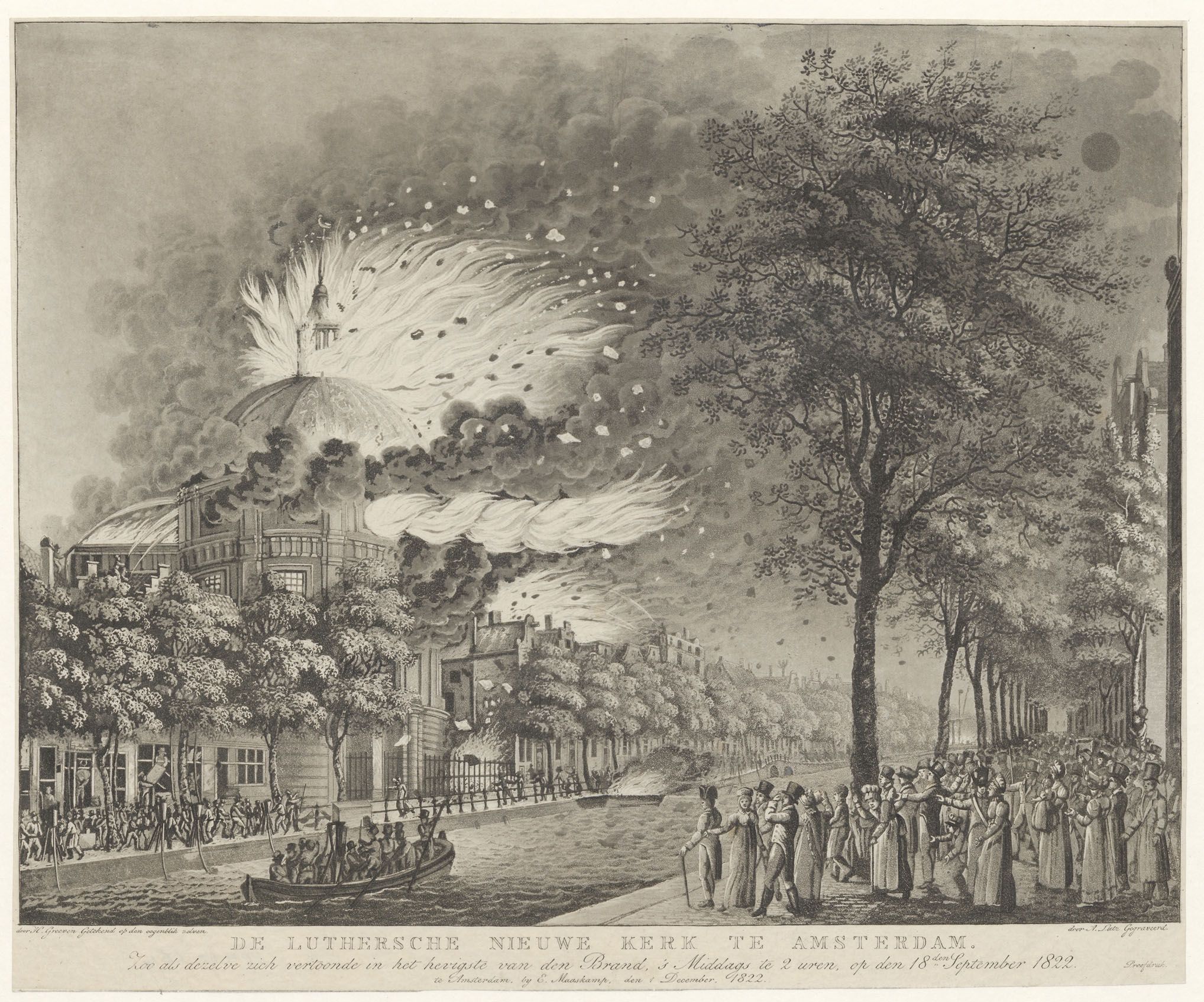 Lutherse Nieuwe Kerk te Amsterdam zoo als dezelve zich vertoonde in het hevigste van den brand 1822