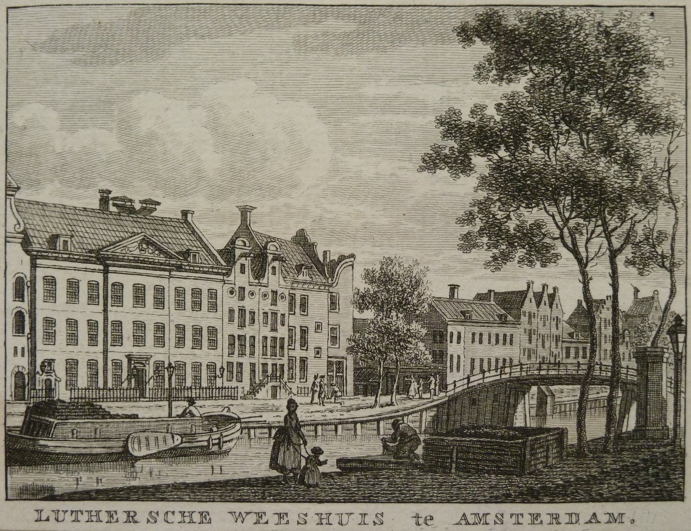Het Lutherse weeshuis aan de Lauriergracht, gezien vanaf de overzijde van het water. Een rechthoekig gebouw met fronton. In het water een schuit. Op de voorgrond een vrouw die een kindje aan de leiband houdt. Rechts een boom. Onderschrift onder de prent: 'Luthersche weeshuis te Amsterdam'.