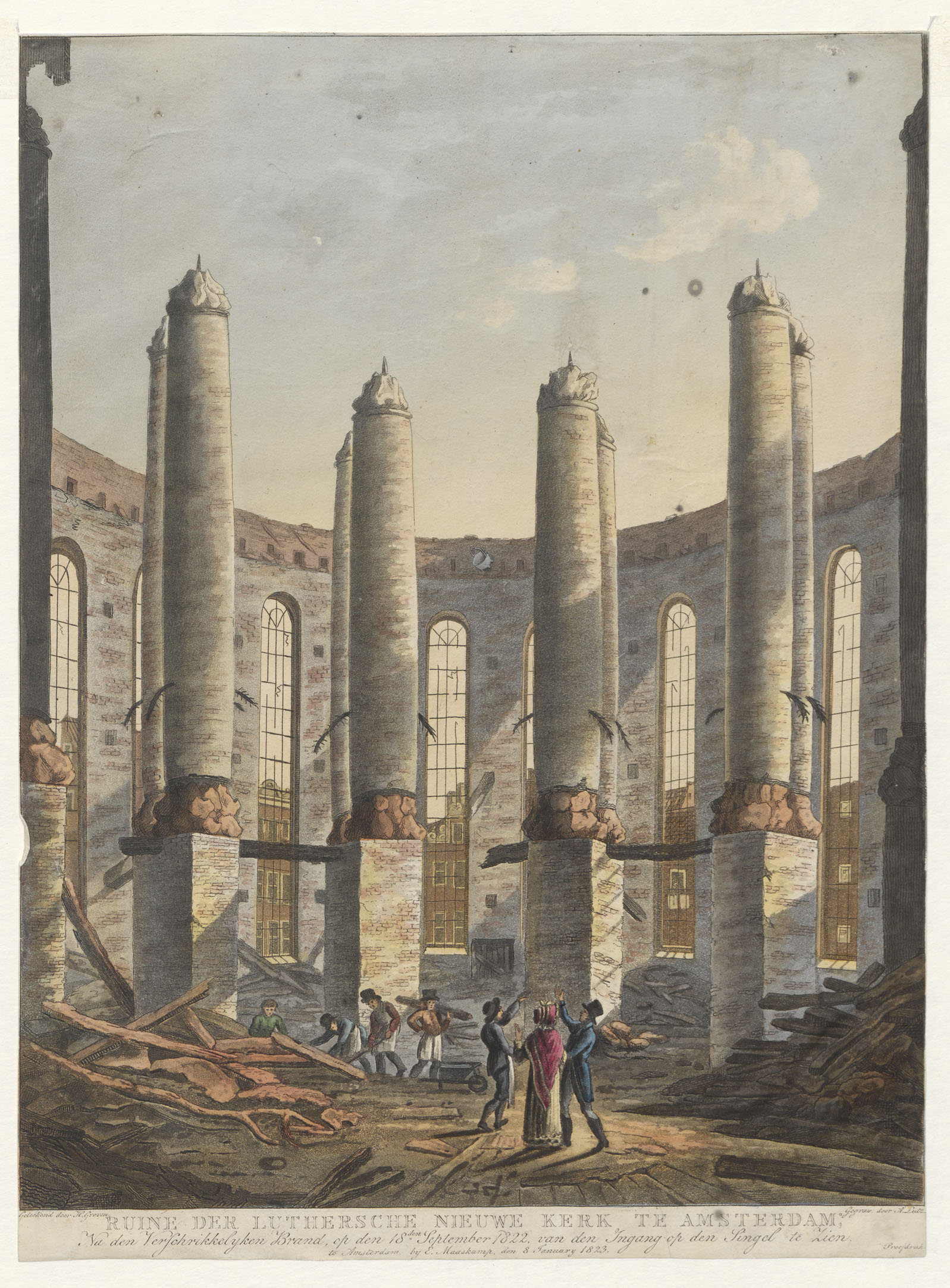 Ruïne van de Lutherse Nieuwe Kerk te Amsterdam na de brand in 1822, ingekleurd