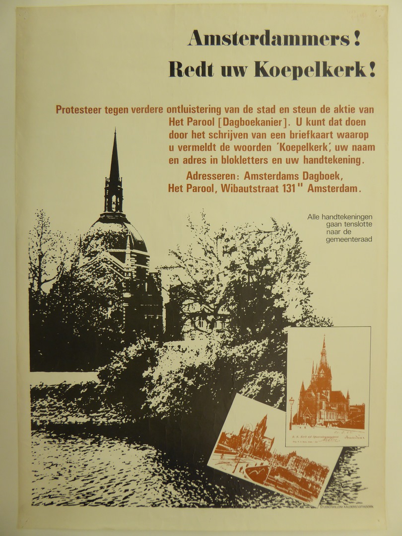 Affiche "Amsterdammers! Redt uw Koepelkerk! ..." tegen de afbraak van de Koepelkerk aan het Leidschebosje te Amsterdam