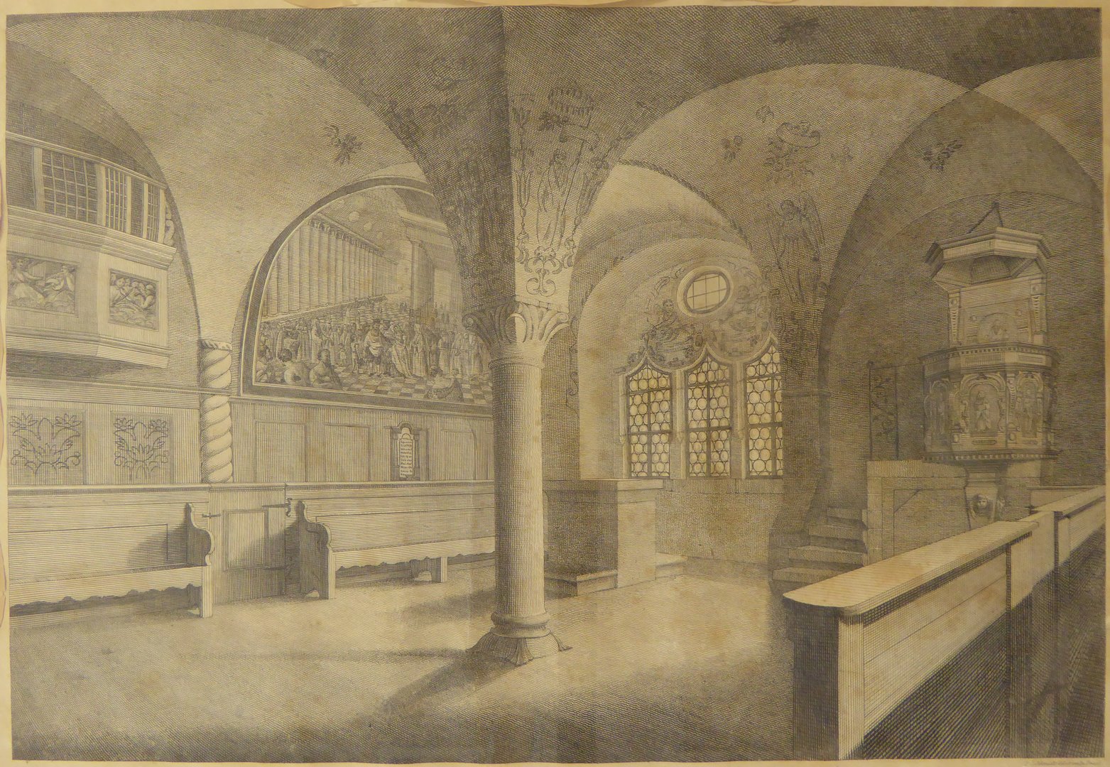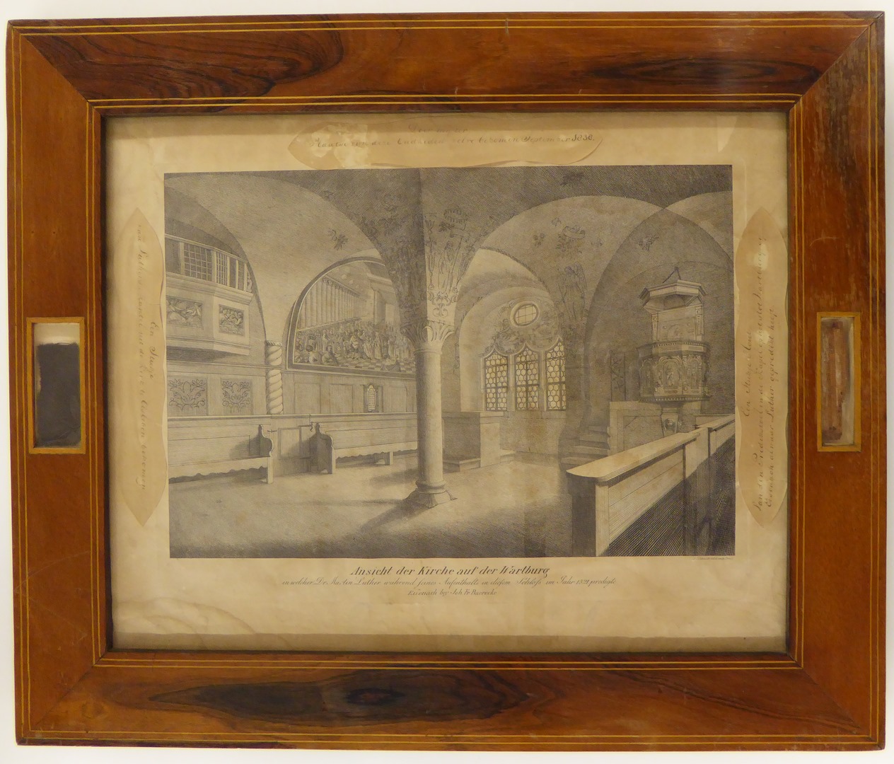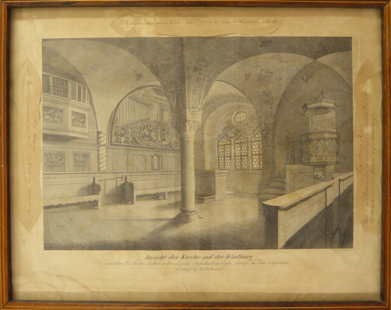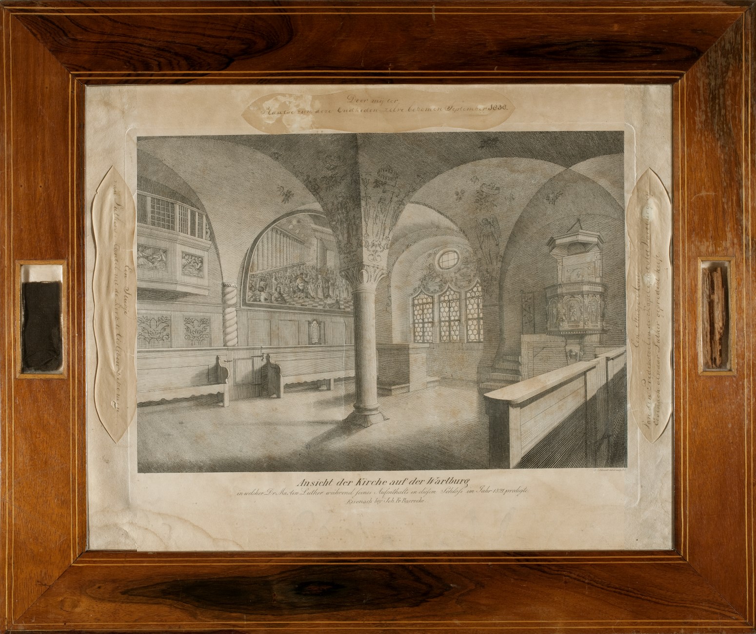 Interieur van de kerk op de Wartburg (Duits), met twee relieken in de lijst