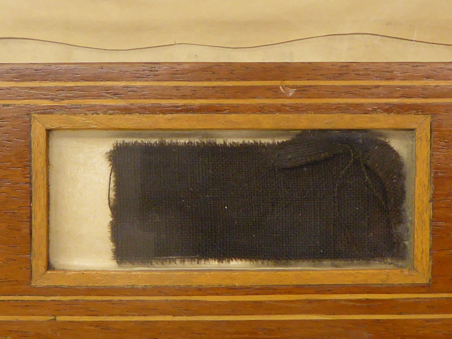 Bijschriften. Middenboven: Door mij ter Plaatse zijn deze Oudheden zelve bekomen September 1838 Links: Een Stukje van Luthers mantel uit de Kerk te Eisleben bekomen Rechts: Een Stukje Hout Van den Predikstoel in de Kapel op het Slot Wartburg bij Eisenach alwaar Luther gepredikt heeft
