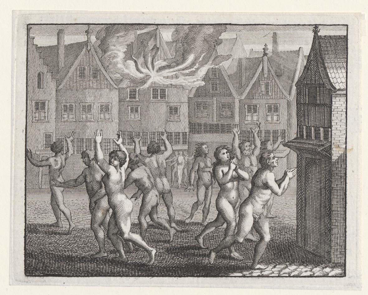 Wederdopers te Amsterdam gaan naakt de straat op, nadat ze hun kleren verbrand hebben
