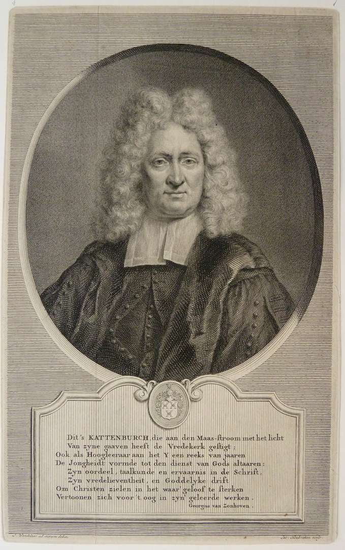 Borstbeeld, frontaal, de kop iets naar rechts, met krulpruik, brede, platte bef en toga over halfgesloten kostuum. In ovaal, met daaronder achtregelig gedicht: 'Dit's Kattenburch...'.