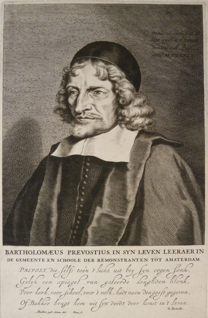 Borstbeeld naar links, met mantel, brede, platte kraag en kalot. Tweeregelig onderschrift en vierregelig gedicht door G. Brandt: 'Prevost, die selfs toen 't licht...'. Linksonder: 'ABakker post obitum'. Rechtsboven vermelding van geboorte-en sterfdatum.