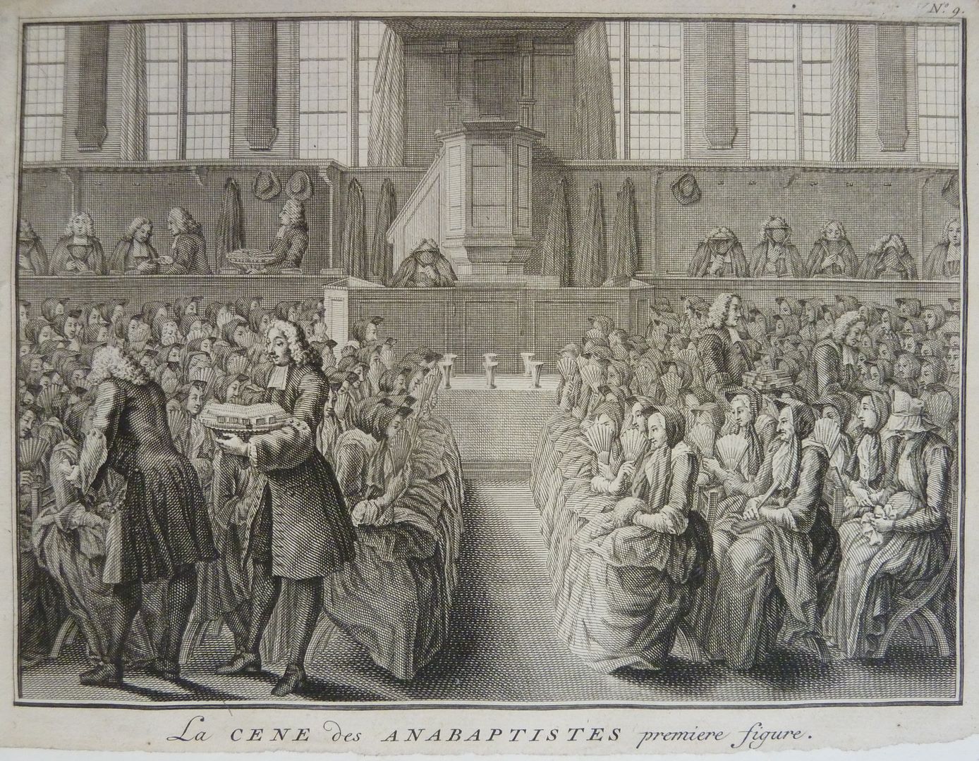 'La cene des anabaptistes premiere figure'. Centraal bevindt zich de kansel met daarvoor een tafel met zes bekers. Vier ambtsdragers met bef, delen van een grote schotel stukjes brood aan de vrouwen die op losse stoeltjes in de kerkruimte zitten. Ter weerszijden van de kansel zitten de overige kerkenraadsleden: links wordt brood uitgedeeld, rechts bidden ...