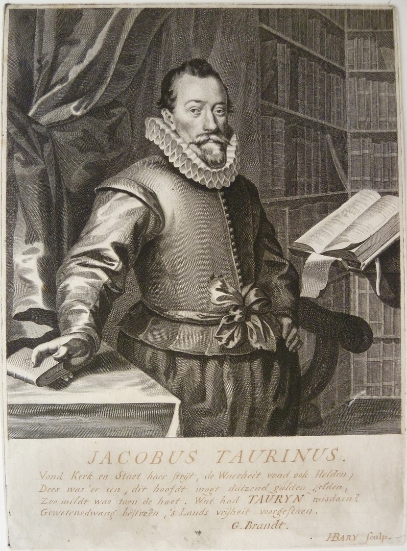 Halffiguur, staande, naar rechts, met in rechterhand, die op de tafel rust, een boek. In kostuum met gepijpte plooikraag. In studeervertrek met links een gordijn en rechts boekenkasten met een lessenaar. Handgeschreven onderschrift: 'Jacobus Taurinus' en vierregelig gedicht door G. Brandt: `Vond Kerck en Staet...'