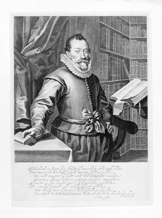 Ter halver lijve rechts, staande in een vertrek vol boeken. Met achtregelig gedicht door G. Brandt: 'Vond kerck en staet haer strijdt...'.
