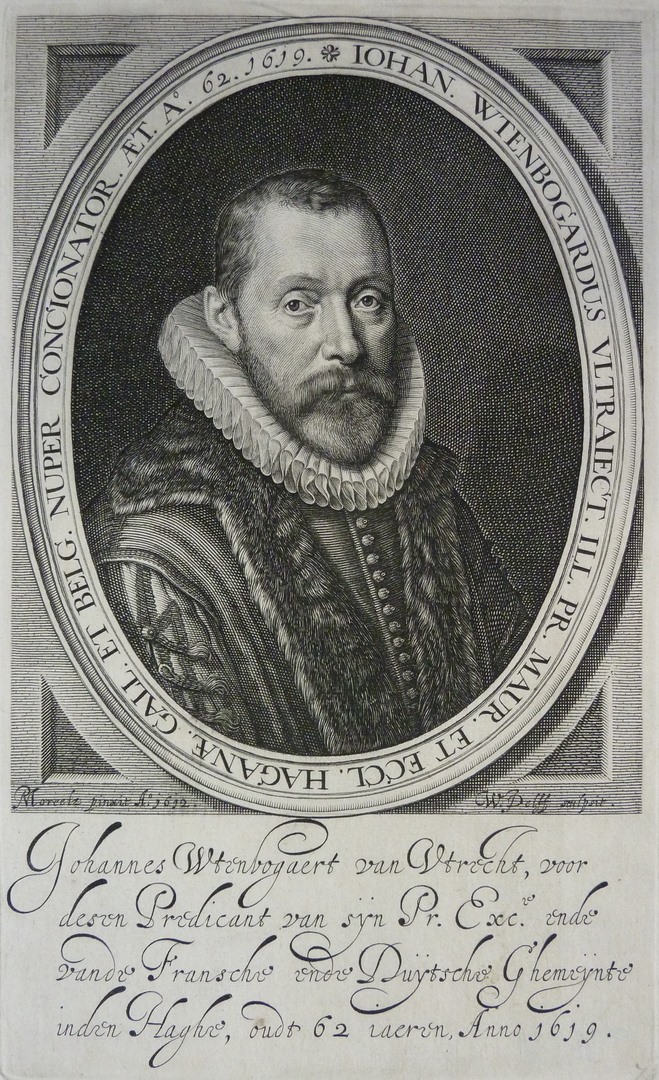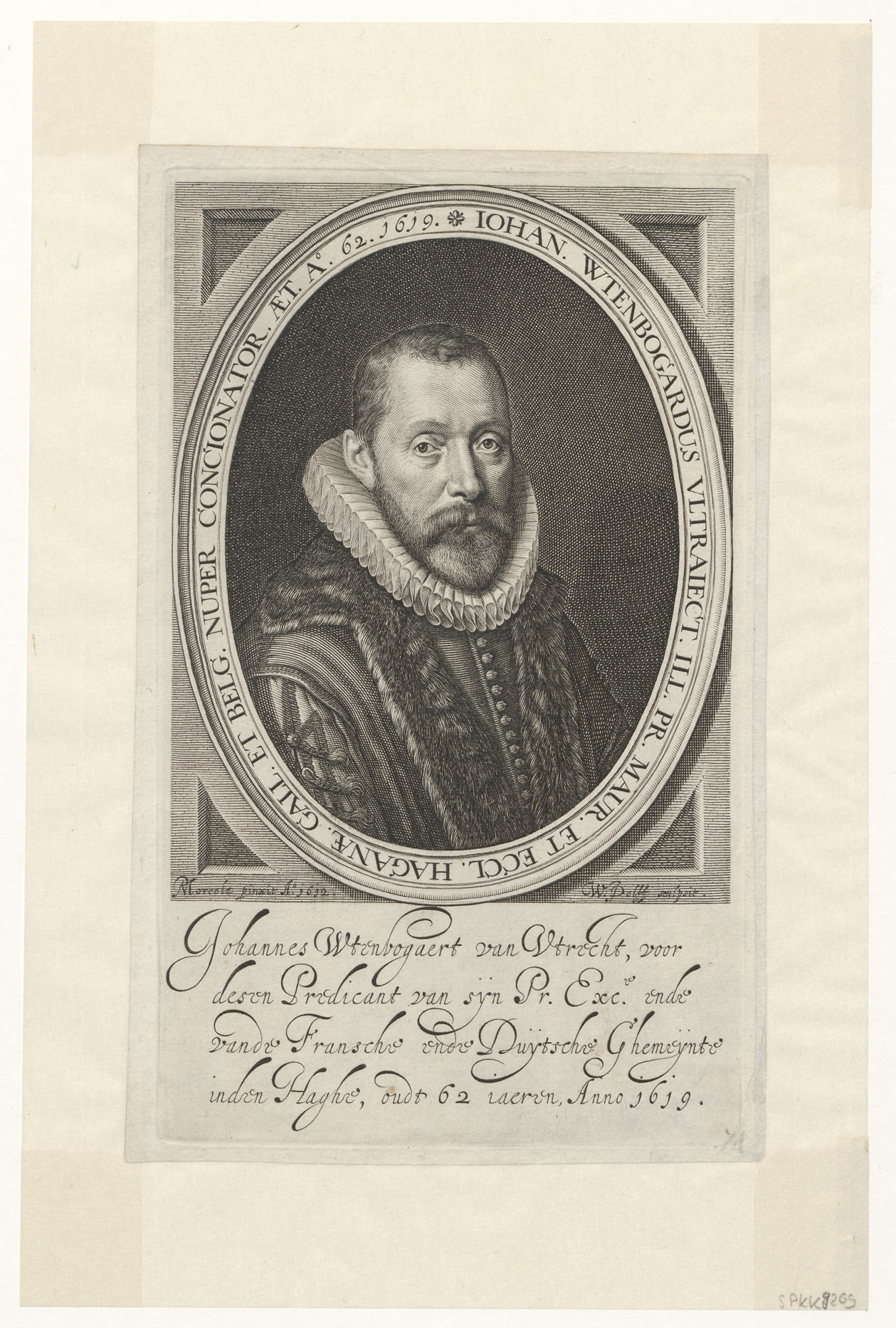 Borstbeeld naar rechts. In ovaal met randschrift 'Iohan Wtenbogardus vltratract. ill. pr. maur. et eccl. haganae. gall. et belg. nuper concionator aet. a 62 1619'. Vierregelig onderschrift: 'Johannes Wtenbogaert van Utrecht...'.