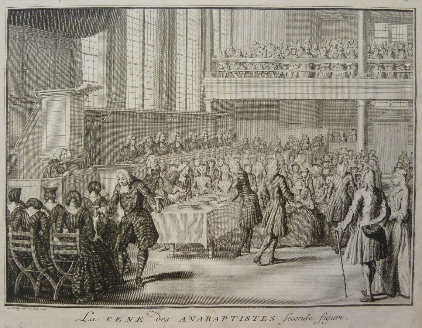 'La cene des anabaptistes. Seconde figure'. Links bevindt zich de kansel met daarvoor een lange tafel met schalen, kannen en bekers. Vier ambtsdragers delen de wijn rond aan de in de kerkruimte zittende vrouwen. Vanaf de galerij kijken mannen en vrouwen toe.