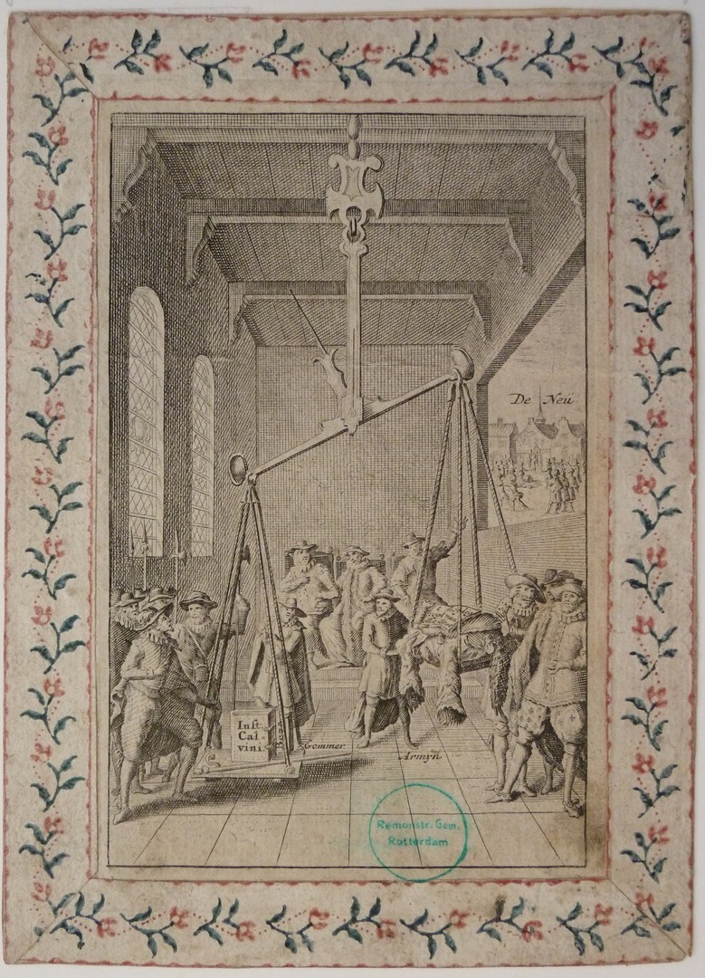In een vertrek waarin diverse mannen aanwezig zijn, hangt aan het plafond een grote weegschaal. Op de lichte, de rechterzijde, ligt een kledingstuk met daarop een document met de tekst 't heilig regt van elke stat'. Aan de zware zijde staat een boek 'Inst. Calvini'. Daarnaast ligt een zwaard. Aan beide zijden van de weegschaal ...