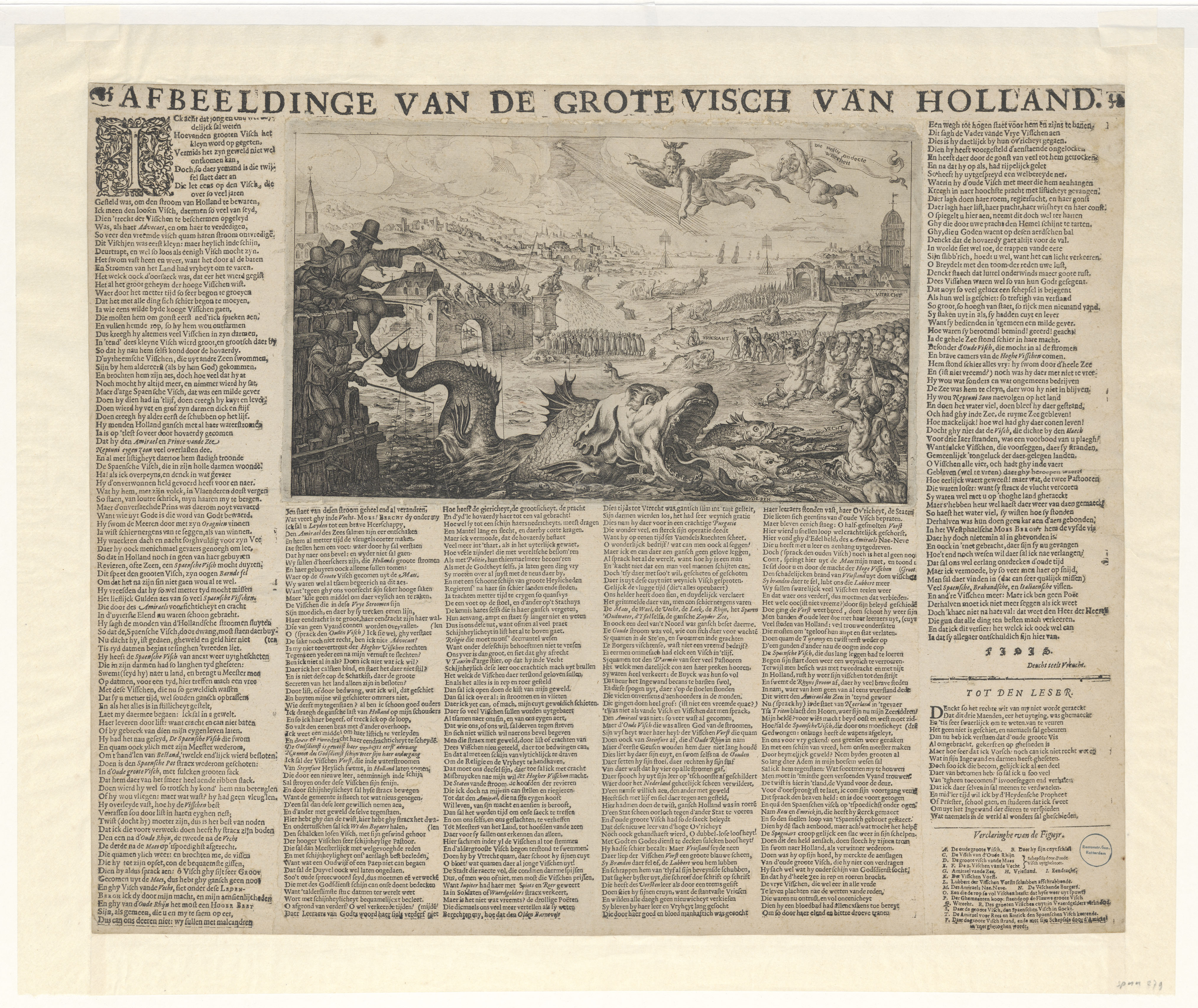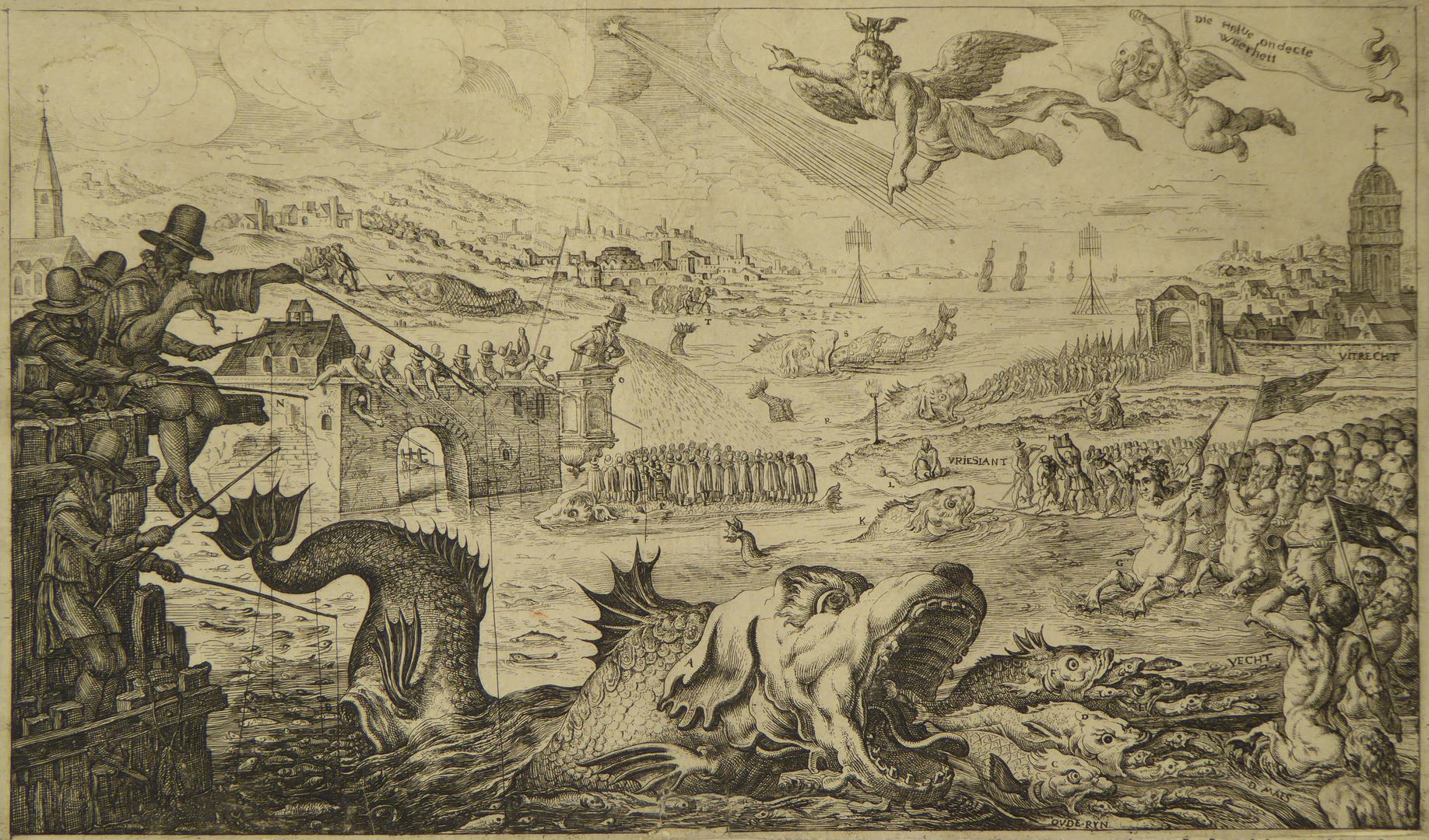 In een brede rivier ligt op de voorgrond een grote vis (Oldenbarnevelt). Deze spuwt allerlei kleine vissen uit. De namen van de rivieren die bij deze kleine vissen geschreven zijn (Vecht, Maas, Rijn) verwijzen naar de steden waar Oldenbarnevelt zijn medestanders had: Utrecht (Ledenberg), Rotterdam (De Groot) en Leiden (Hogerbeets). Links zitten enkele personen te ...