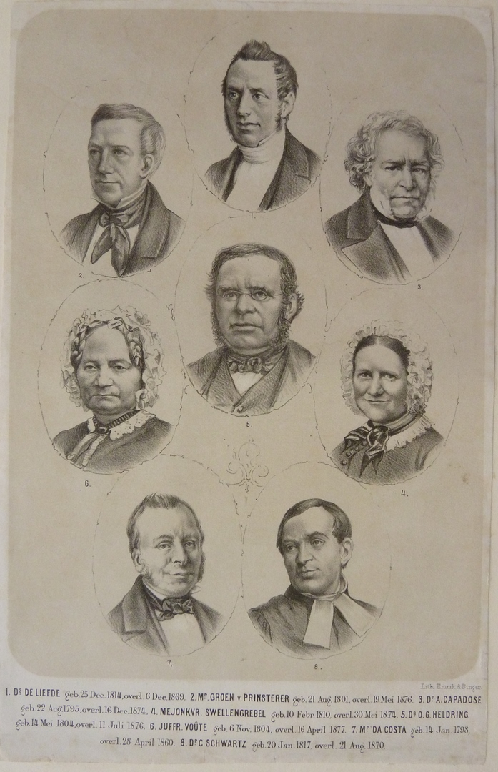 Acht portretten van figuren uit het Reveil: Ds. J. de Liefde, G. Groen van Prinsterer, A. Capadose, Mej. Swellengrebel, Ds. O.G. Heldring (centraal), mej. Voûte, I. Da Costa, C. Schwartz.