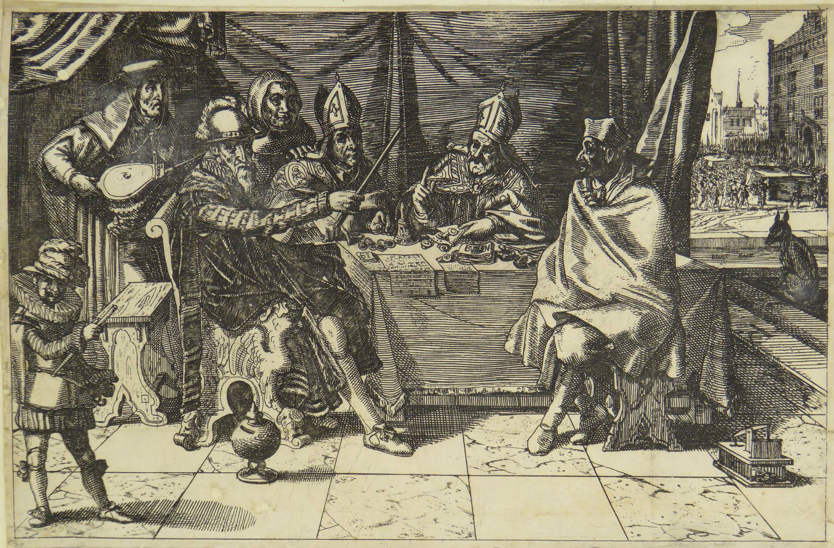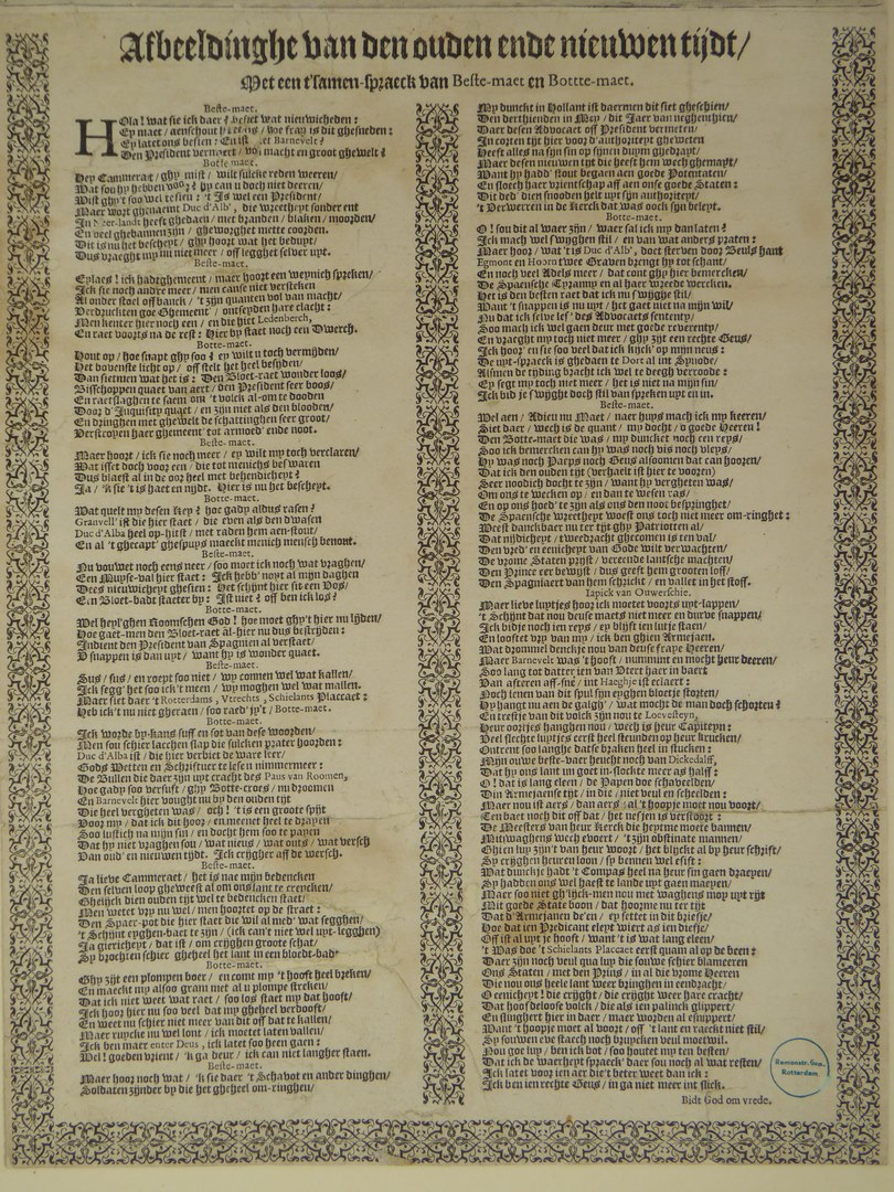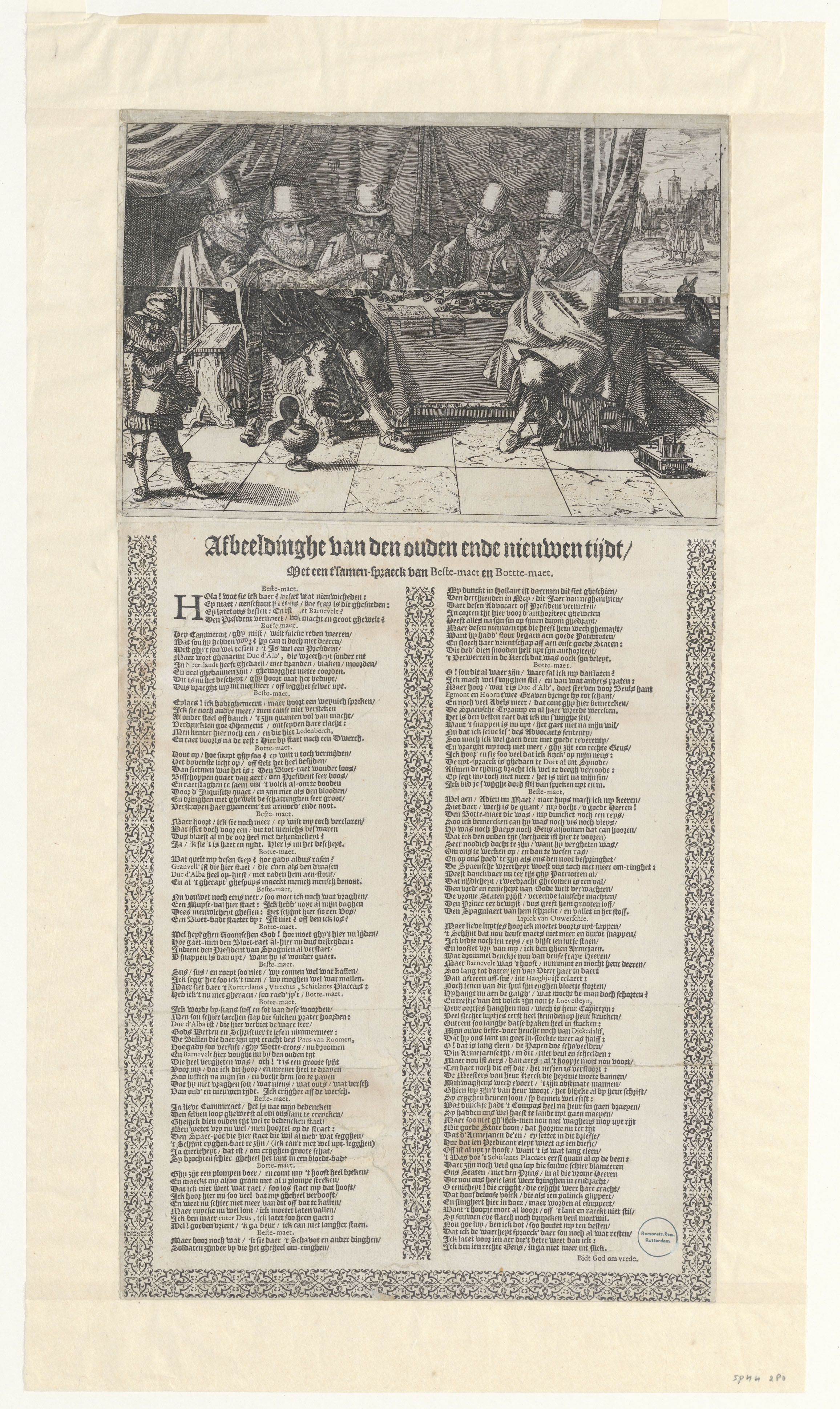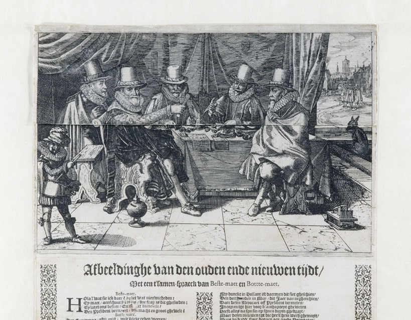 De prent bestaat uit twee delen. Op de bovenste helft van de prent is een tweede prent geplakt, zodat de prent kan worden opengeklapt. In dichtgeklapte toestand toont de prent een vertrek waarin vijf mannen aan tafel zitten, onder wie Oldenbarnevelt (links voor). Hij houdt een papier in de handen waarop te lezen staat: 'Schie ...