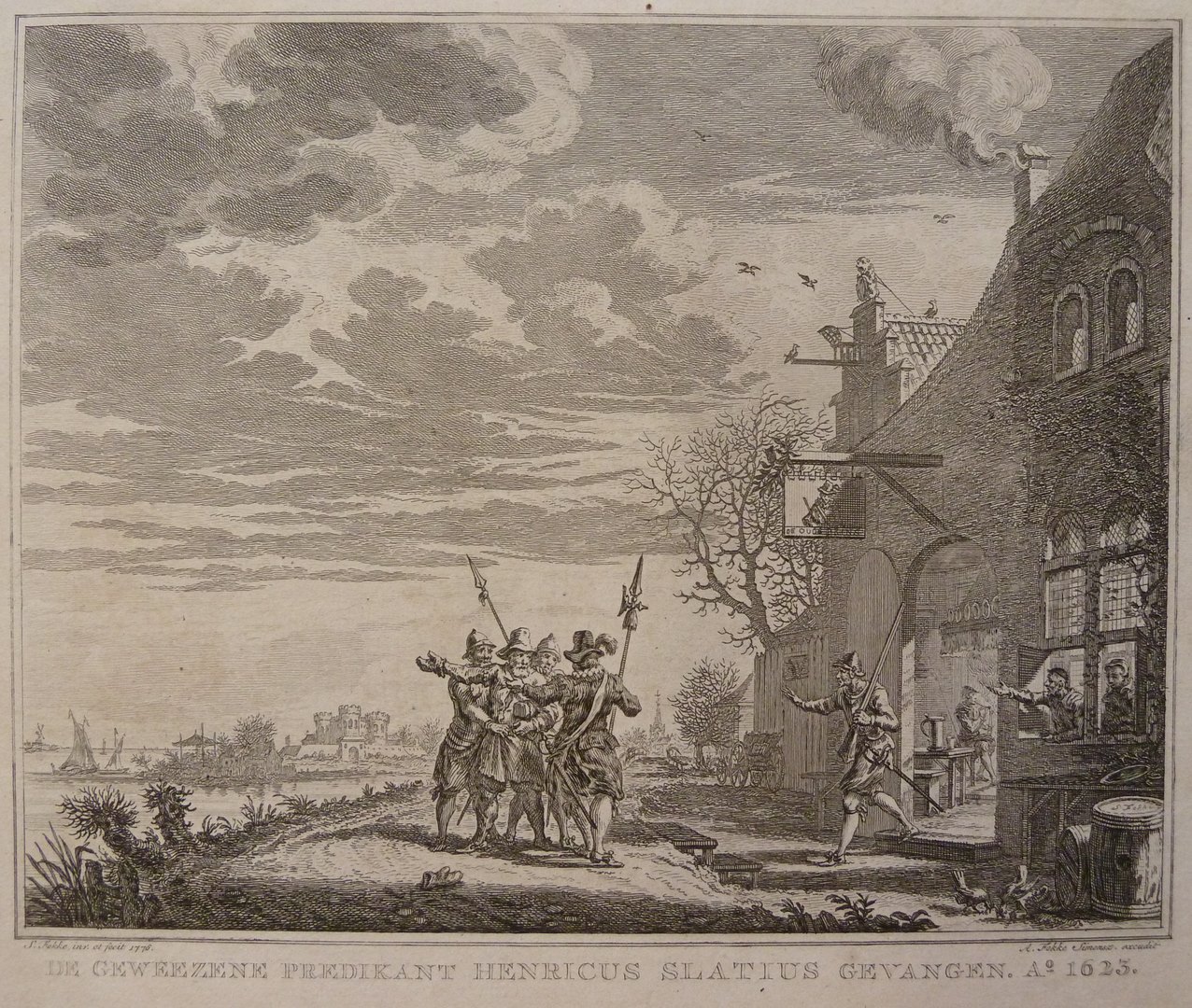 Voor een herberg, rechts, wordt Hendrik Slatius, herkenbaar aan zijn hoed, gevangengenomen. Op de achtergrond een kasteel. Onder de prent een eenregelig onderschrift: `De gewezene predikant...'.