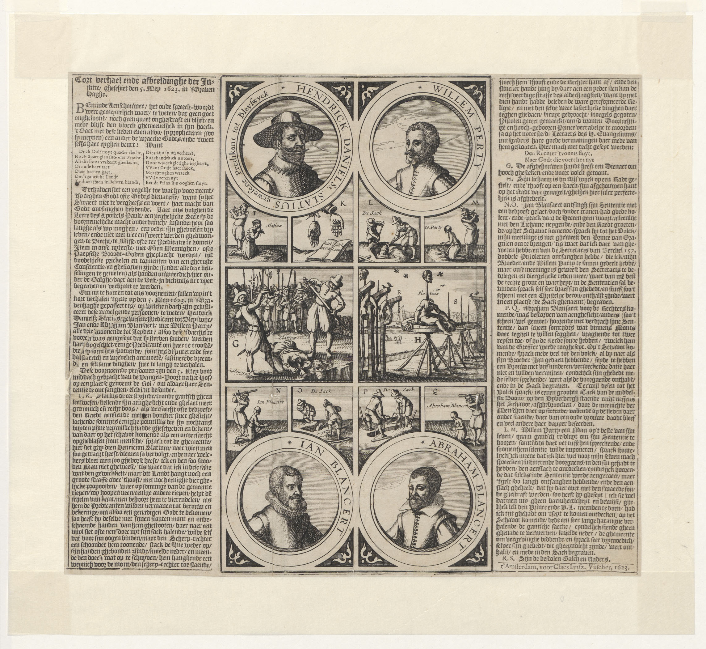 Centraal de onthoofding van de daders van de aanslag op Maurits. Daaromheen in medaillons de portretten van de daders: Hendrik Slatius, Willem Perty, Jan Blancert, en Abraham Blancert. Opschrift: 'Duck Dalf nooit quader docht, Noch Spaengien snooder wrocht, als dit boos verkeert geslacht'.
