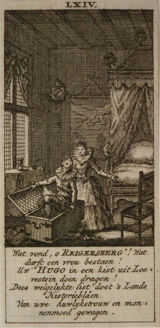 In een kamer stapt Hugo de Groot, geholpen door zijn vrouw, in de boekenkist. Boven de prent het nummer LXIV, onder de prent een achtregelig onderschrift.