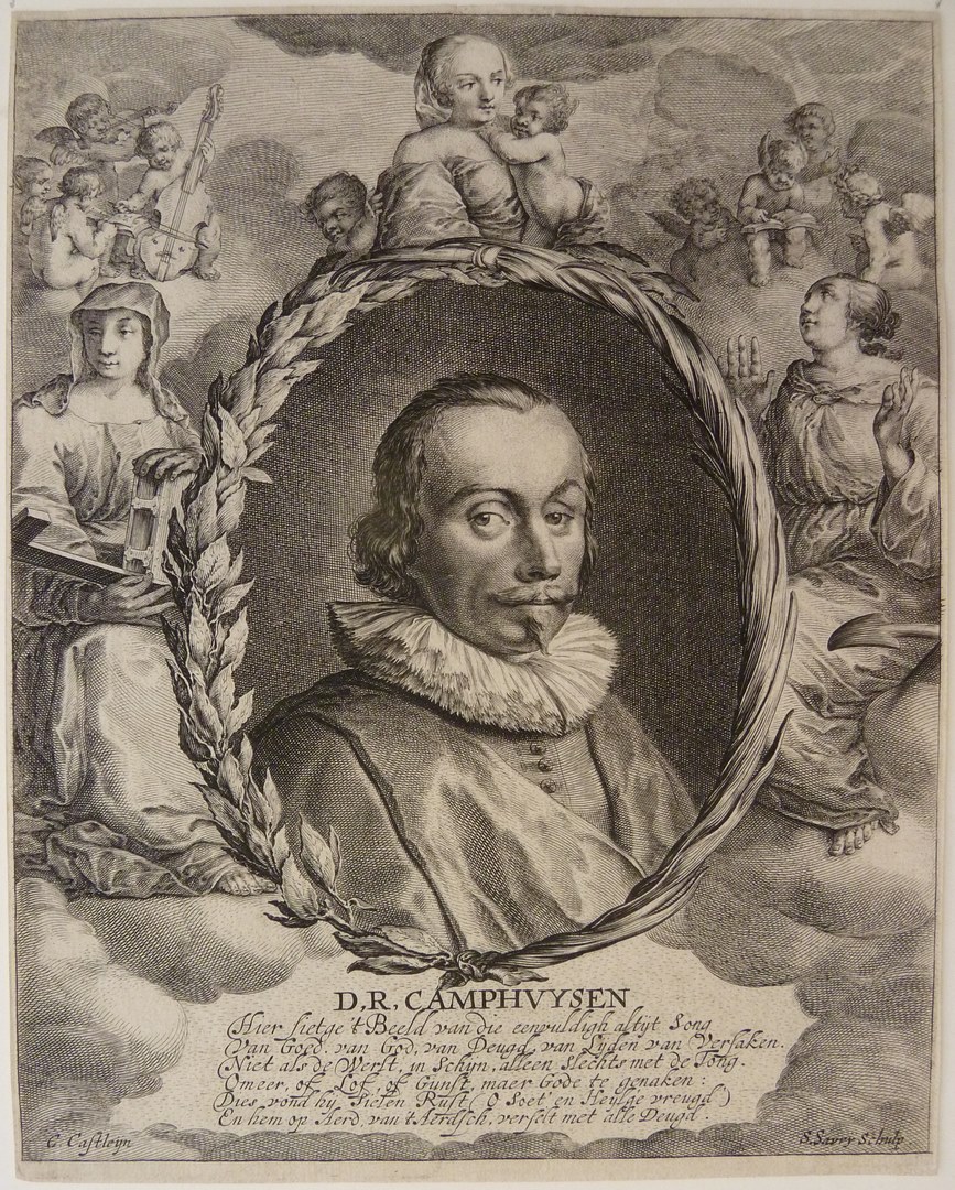 Borstbeeld naar rechts. In ovaal met randwerk waarin drie allegorische figuren Geloof, Hoop en Liefde en diverse putti. Onderschrift: 'D.R.Camphuysen' en zesregelig gedicht: 'Hier sietge 't beeld ... deugd'.