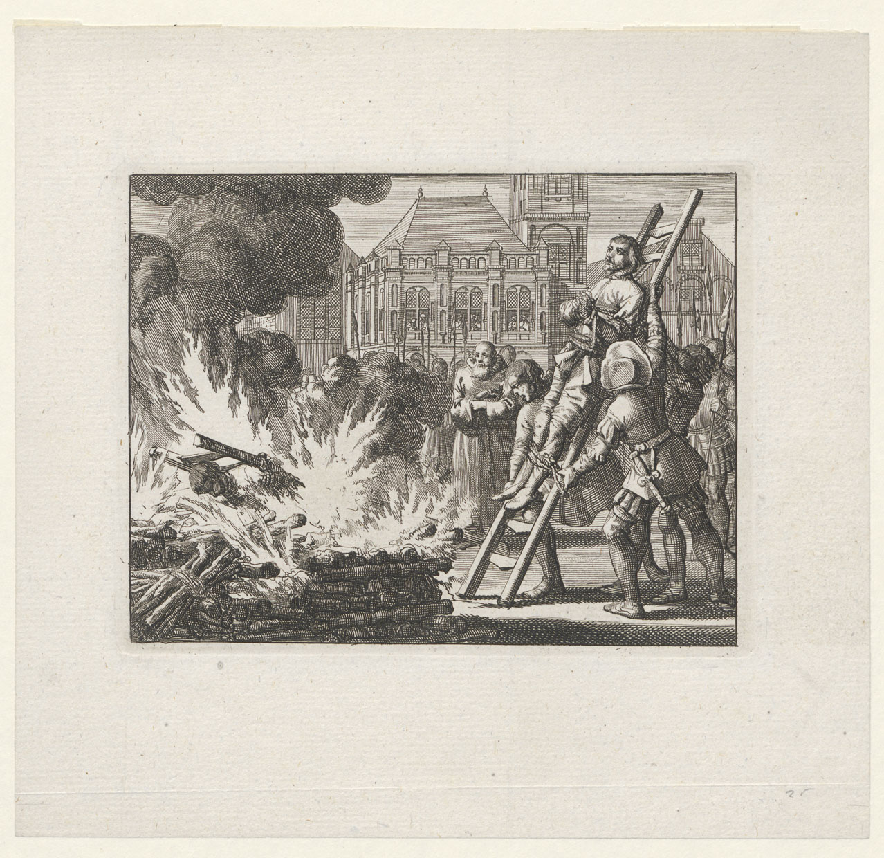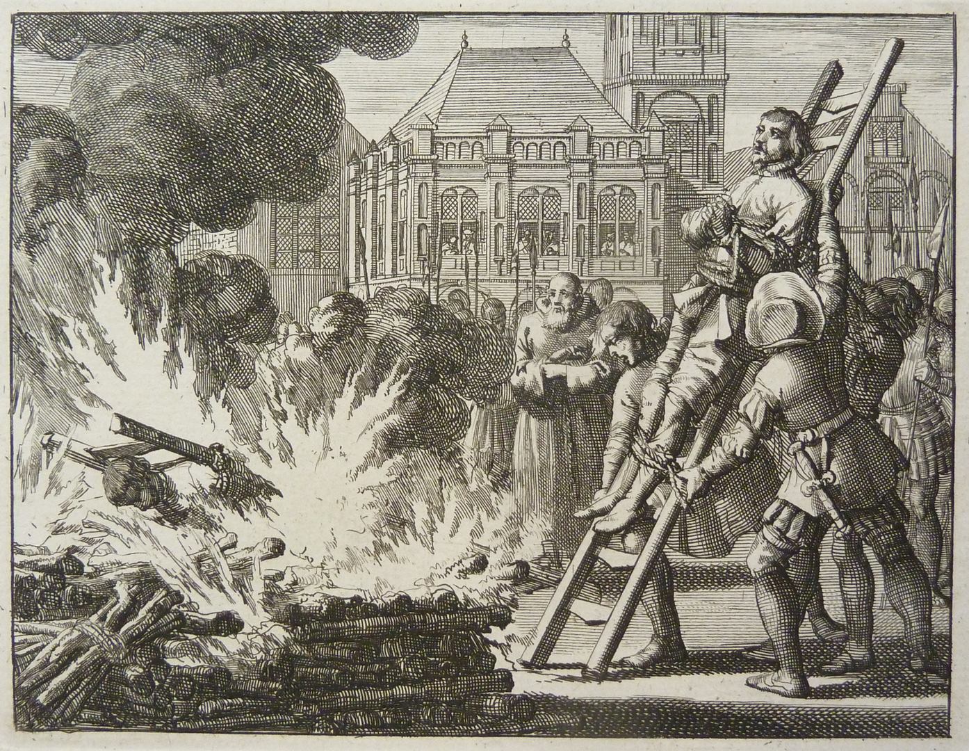 Voor het stadhuis van Amsterdam staan twee mensen klaar om een op een ladder gebonden doopsgezinde in het vuur te gooien. Een andere martelaar bevindt zich reeds in de vlammen.