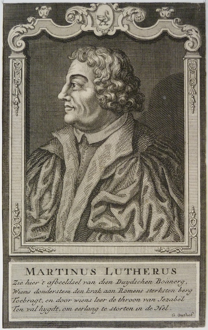 Borstbeeld en profil. In een kader met aan de bovenzijde een zwaan. Met onderschrift: 'Martinus Lutherus' en vierregelig gedicht door G. Outhof: 'Zie hier 't afbeeldsel...'.
