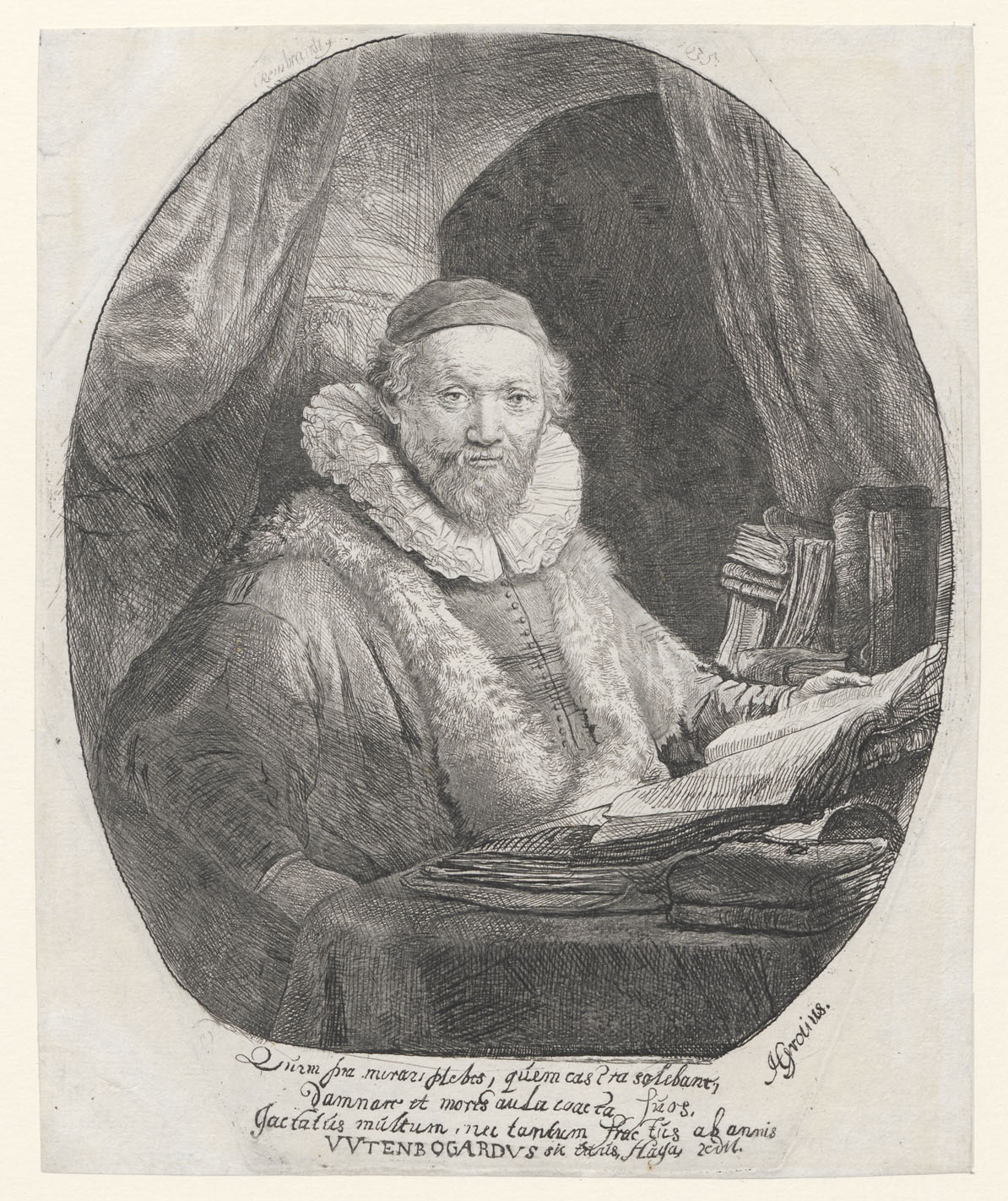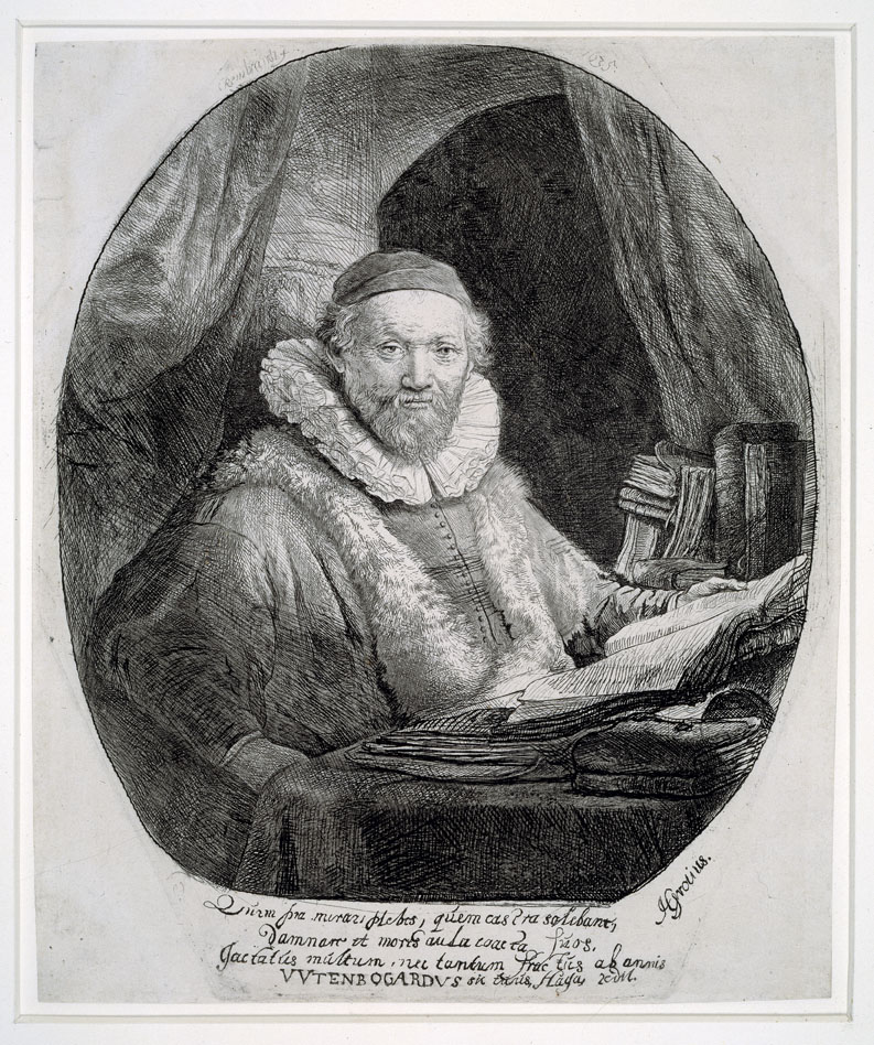 In een vertrek met aan weerszijden draperieën, zit Wtenbogaert aan een tafel, waarop een kleed ligt en verder allerlei boeken staan en liggen. Alleen het bovenlichaam is zichtbaar, het gezicht is naar de beschouwer toegewend. Zijn linkerhand houdt een opengeslagen boek vast, de rechterarm lijkt op een leuning te steunen terwijl de rechterhand slechts half ...