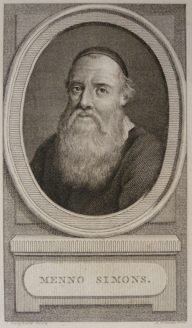 Borstbeeld naar rechts, aanziend, in eenvoudig kostuum met kalot en lange baard. In ovaal met eenregelig onderschrift: 'Menno Simons.'.