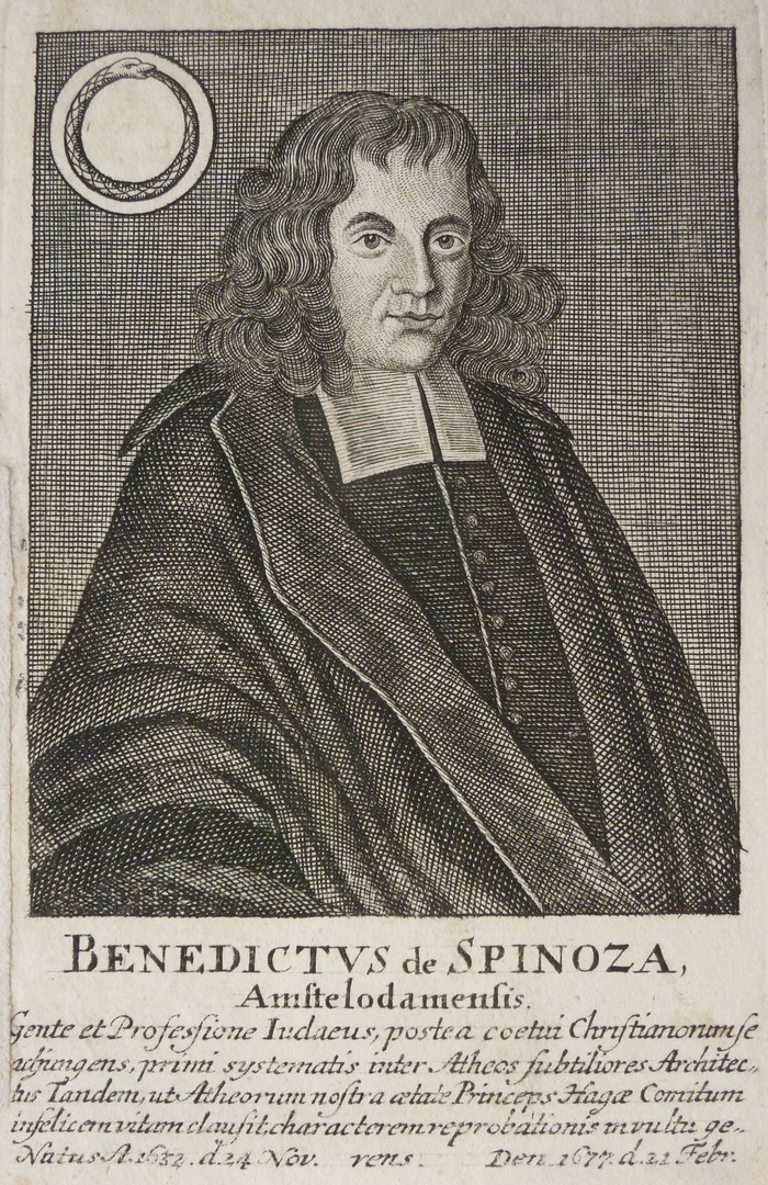 Borstbeeld naar rechts, met mantel en brede, platte bef. Links boven een slang die in zijn eigen staart bijt. Onder zevenregelig onderschrift: 'Benedictus de Spinoza...'.