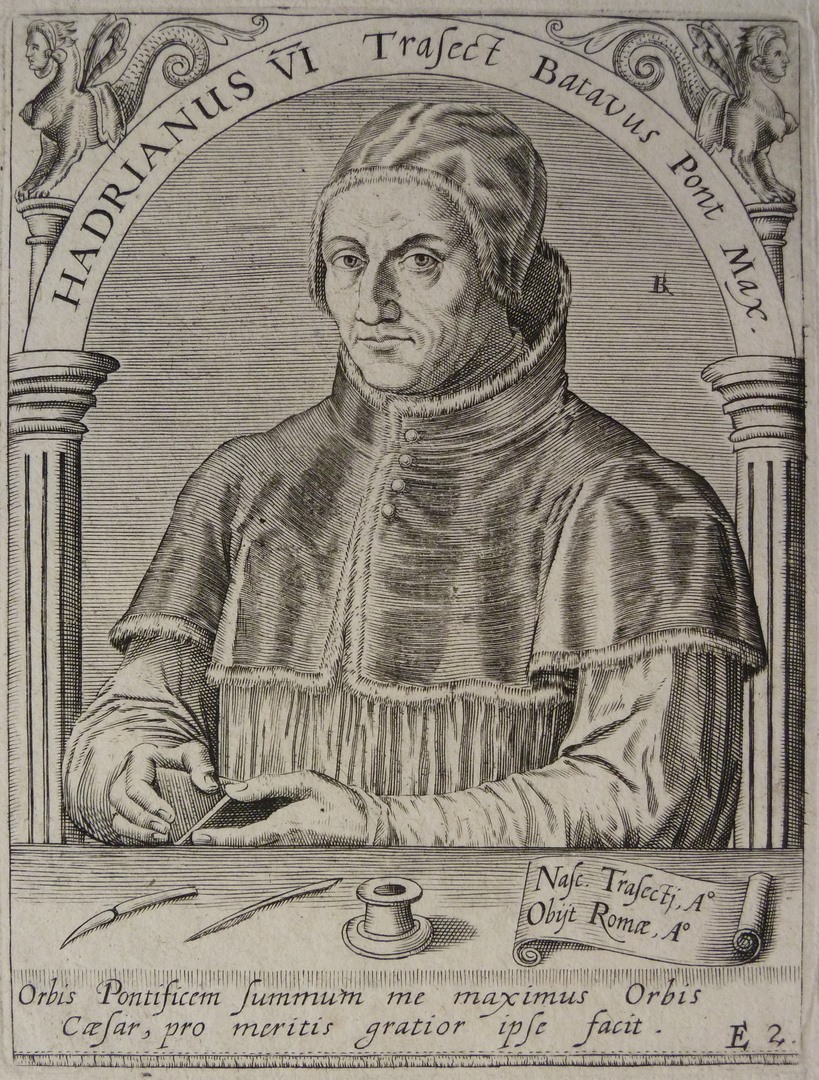 Halffiguur naar links met boek in de hand. Onder een toog met opschrift: 'Hadrianus VI traject Batavus...'. Met tweeregelig onderschrift: 'Orbis Pontificem...'.