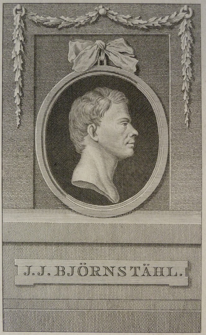 Borstbeeld en profil naar rechts. In ovaal met omkadering en éénregelig onderschrift: 'J.J. Björnstahl'.