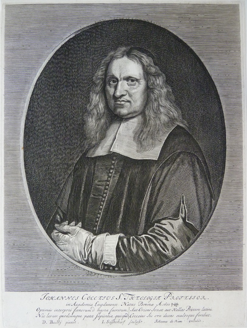 Halffiguur naar links. In ovaal. In toga met brede, platte bef, lang haar en handschoen. Met vierregelig onderschrift: 'Johannes Coccejus...'.