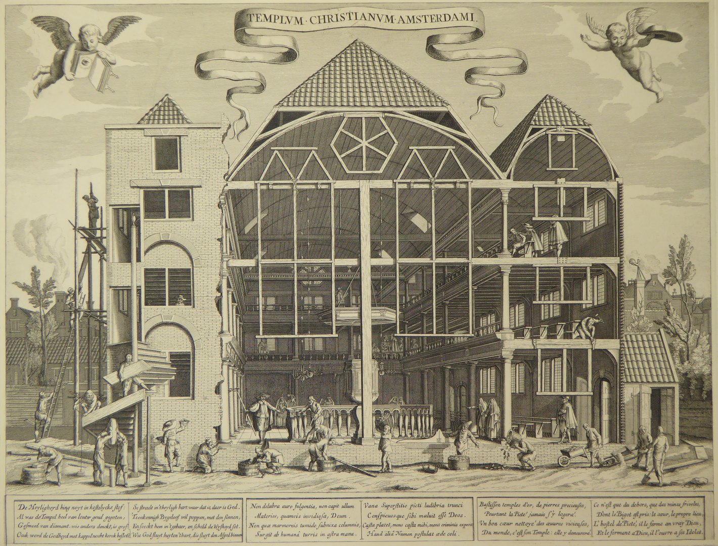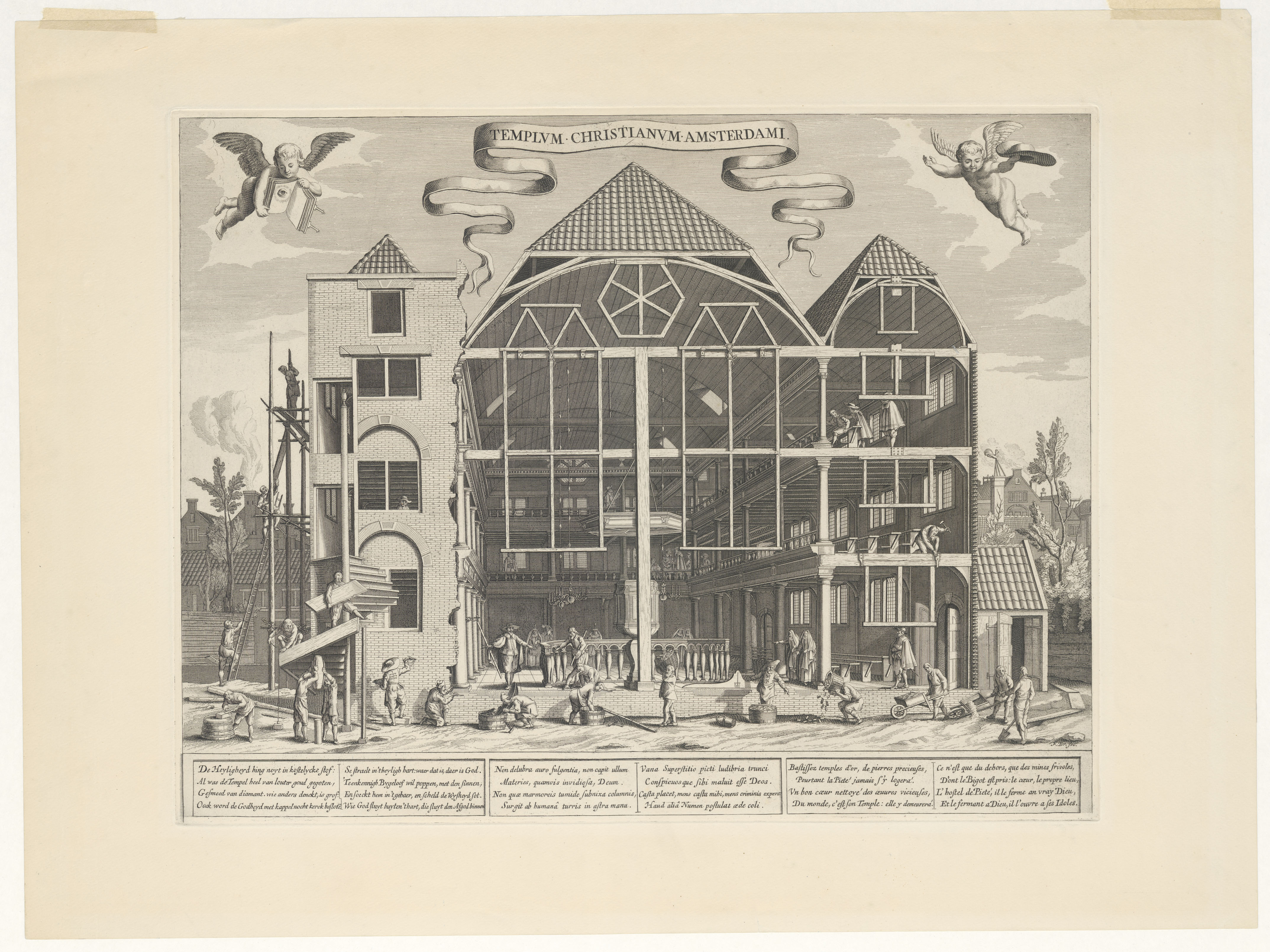 De voorstelling toont de Remonstrantse schuilkerk te Amsterdam, waarvan de gevel voor het grootste deel als in aanbouw zijnde wordt voorgesteld. Daardoor is het mogelijk het interieur te zien. Het gebouw heeft twee maal twee galerijen. Verder zijn preekstoel en dooptuin zichtbaar. Allerlei werklieden zijn bezig met de bouw van de kerk. Boven het gebouw ...