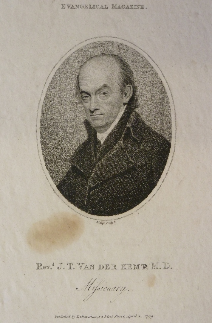 Borstbeeld naar links. In ovaal met tweeregelig onderschrift: 'Rev.d. J.T. van der Kemp. Missionary'. Uit: Evangelical Magazine.