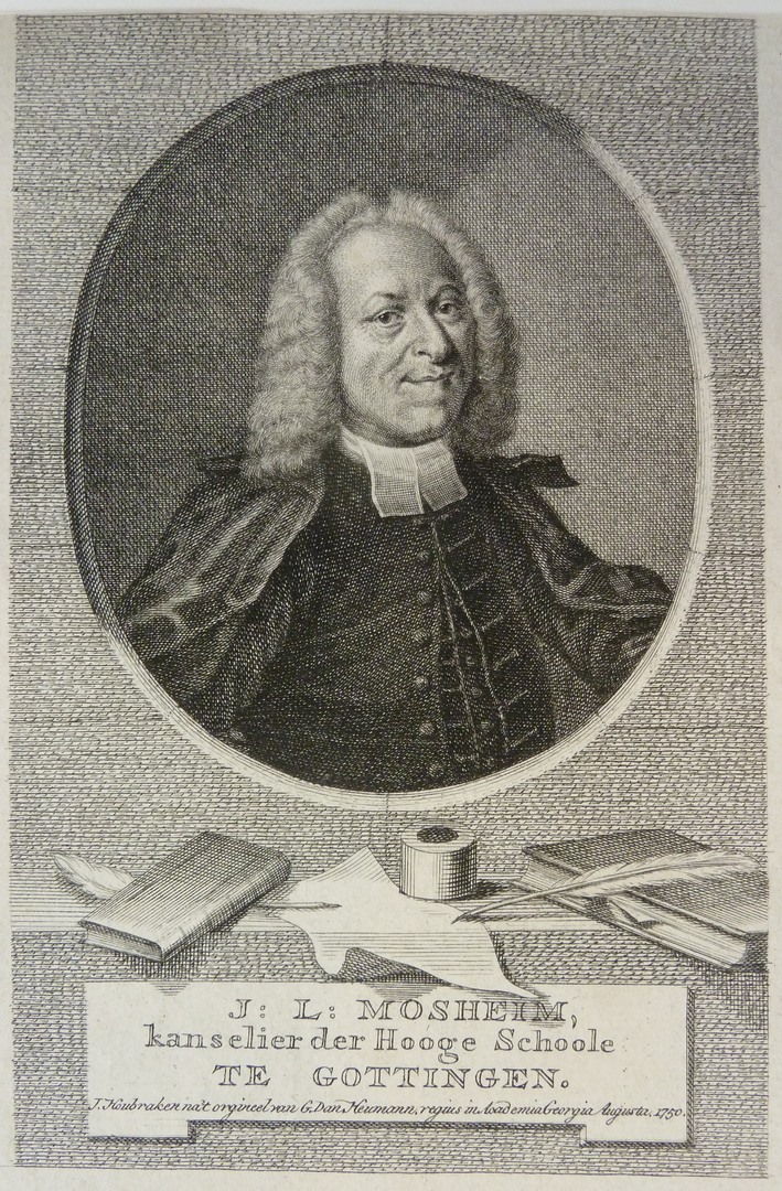 Borstbeeld naar rechts. In ovaal met randwerk en drieregelig onderschrift: 'J: L: Mosheim, kanselier der Hooge Schoole...'.