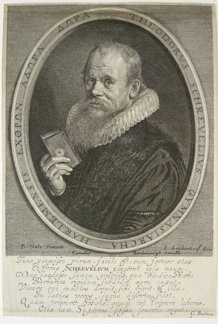 Borstbeeld naar links, met in rechterhand een boek. In ovaal met Latijns en Grieks randschrift: 'Theodorus Schrevelius...'. Met achtregelig vers door C. Barlaeus: 'Tunc pinxisse virum...'.