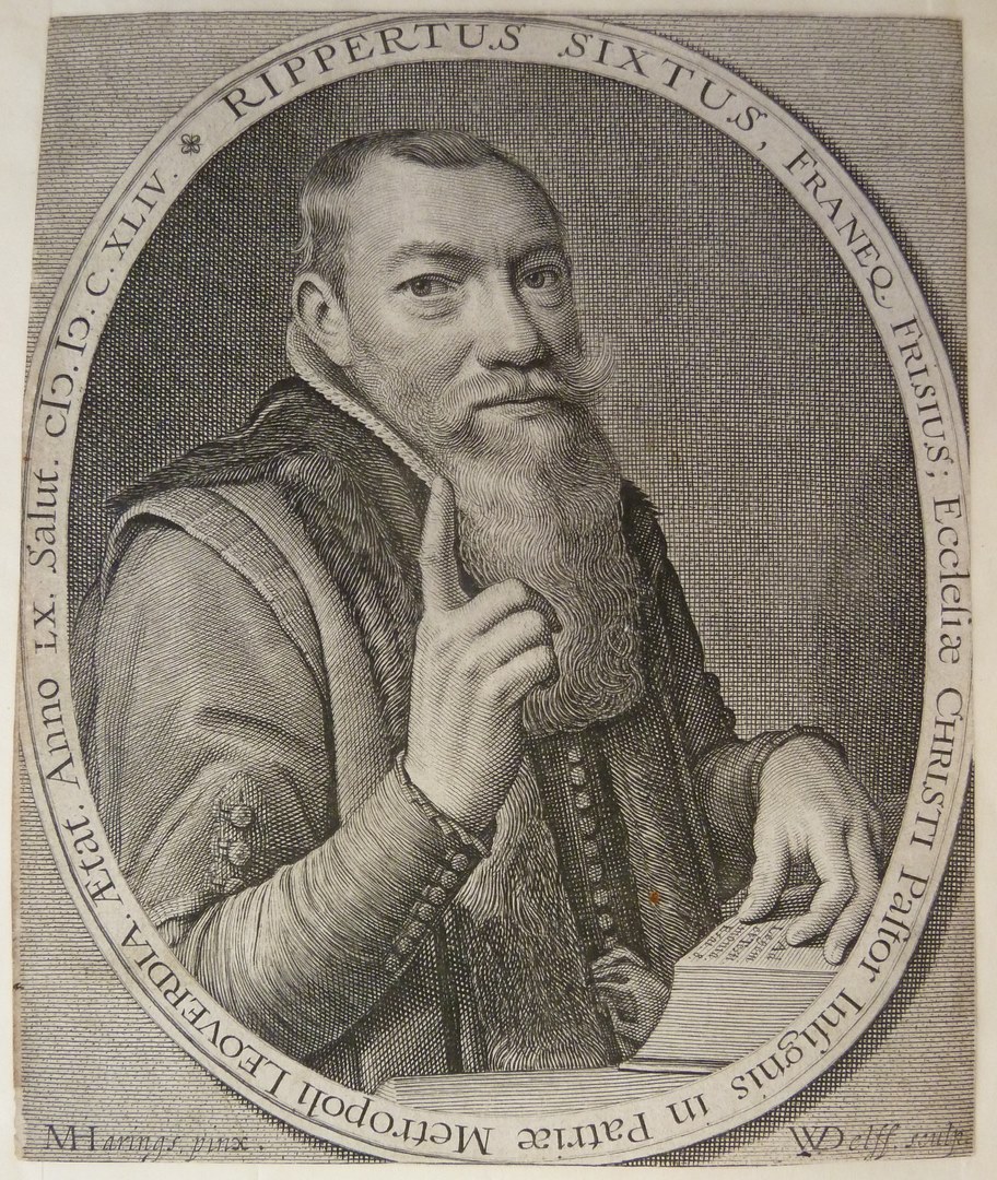 Halffiguur naar rechts, met linkerhand rustend op bijbel en rechterhand opgeheven in spreekgebaar. In ovaal met randschrift: 'Rippertus Sixtus...'. De prent is afgesneden: er behoren twee vierregelige Latijnse verzen onder (zie Hollstein).