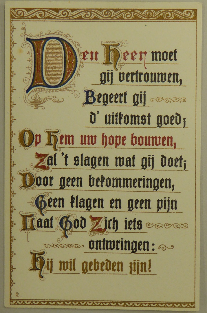Tekstplaatje in zwart, rood en goud met "Den Heer moet gij vertrouwen, begeert gij d' uitkomst goed;"