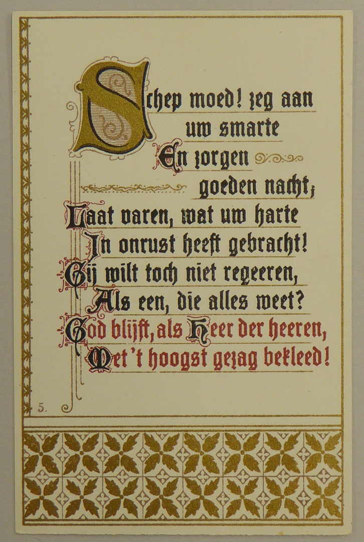 Tekstplaatje in zwart, rood en goud met "Schep moed! Zeg aan uw smarte en zorgen goeden nacht;"