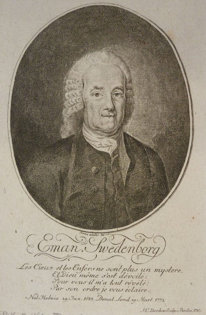 Borstbeeld, frontaal. In ovaal met zesregelig Frans en Latijns onderschrift: 'Eman Swedenborg...'.