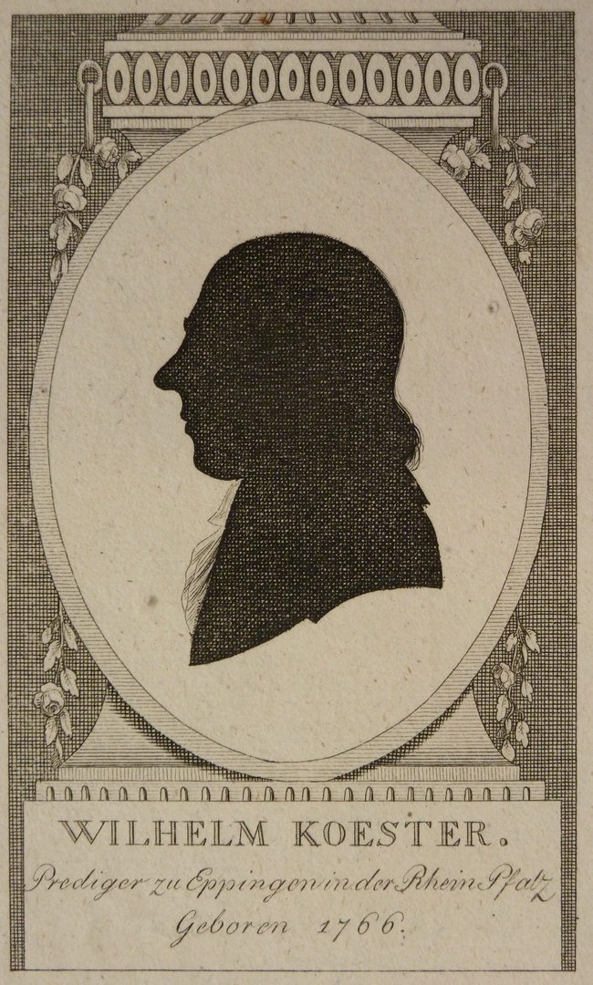 Silhouet en profil naar links. In ovaal met randwerk en drieregelig onderschrift: `Wilhelm Koester. Prediger zu...'.
