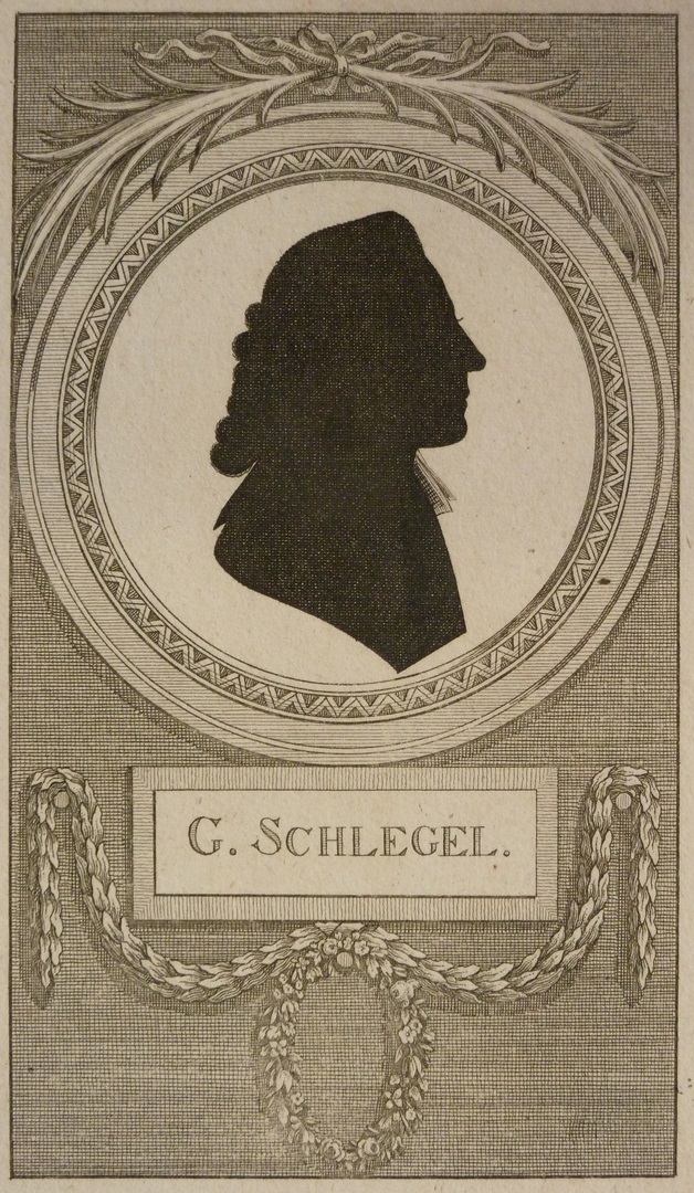 Silhouet en profil naar rechts. In medaillon met randwerk en onderschrift: 'G. Schlegel'.