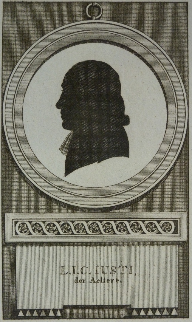 Silhouet en profil naar links. In medaillon met randwerk en tweeregelig onderschrift : 'L.I.C. Justi der Aeltere'.