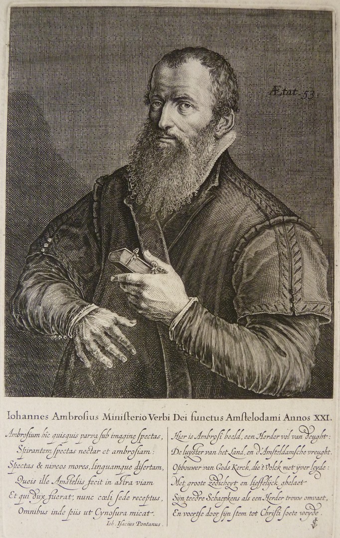 Halffiguur naar links, met bijbel in de linkerhand. Met een éénregelig onderschrift: 'Iohannes Ambrosius Ministerio...' en een zesregelig Latijns gedicht `Ambrosium hic quisquis...'door I.I. Pontanus en een zesregelig Nederlandse gedicht: 'Hier is Abrosi beeld...'.