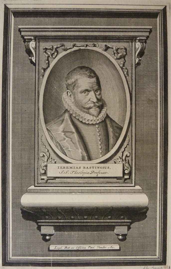 Borstbeeld naar rechts. In ovaal met ruim randwerk en tweeregelig onderschrift: 'Ieremias Bastingius. S.S. Theologiae Professor'. Onder een console de tekst: 'Lugd. Bat. ex Officina Petri Vander Aa'.
