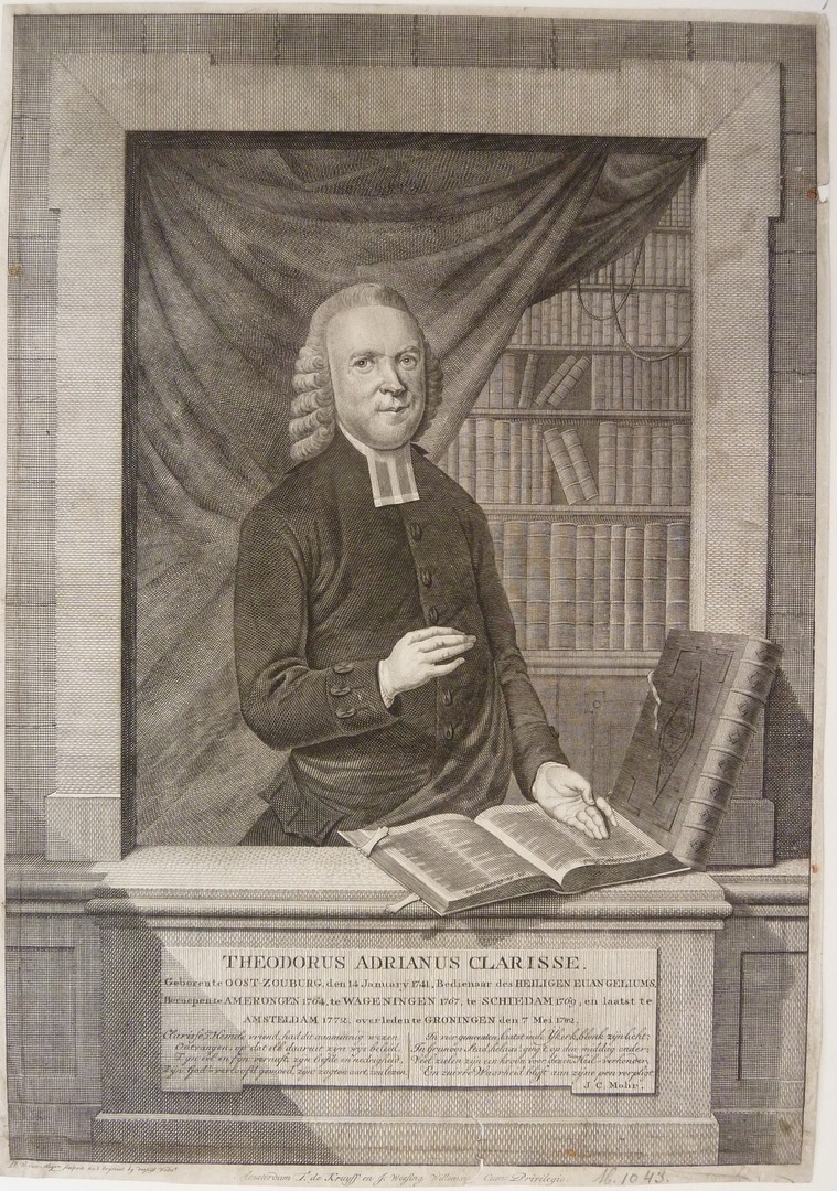 Halffiguur naar rechts, staande onder een toog. Met rechterhand in sprekend gebaar en linkerhand op de bijbel. Op de achtergrond een draperie en een boekenkast. Vierregelig onderschrift: 'Theodorus Adrianus Clarisse ... 1782' en vierregelig gedicht door J.C.Mohr, 'Clarisse 's Hemels vriend ... verpligt'. M.o. kleine (gerepareerde) scheur, r.b. rand aangeheeld.