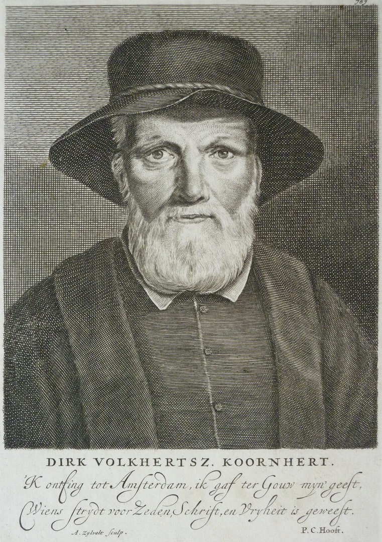 Borstbeeld frontaal. In rechthoek met onderschrift : 'Dirk Volkhertsz. Koornhert' en tweeregelig gedicht door P.C. Hooft: ''K ontfing tot Amsterdam ... geweest'. R.b. '767'.